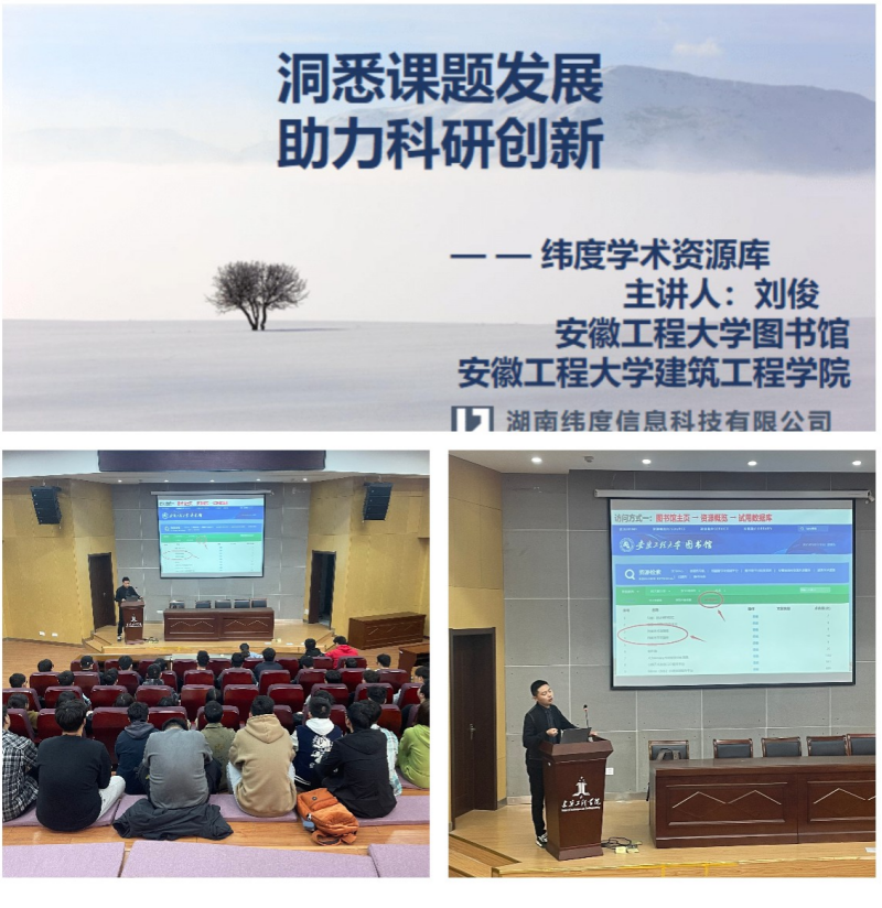 刘俊以“洞悉课题发展,助力科研创新”为主题为同学们做报告。报告中,刘俊首先介绍了“纬度学术资源库”和“纬度外文专题库”,并围绕纬度学术在科研文献检索、下载,分析主题,课题热点追踪,科学选刊等方面的应用做了详细的讲解。整个报告干货满满,学生受益匪浅。