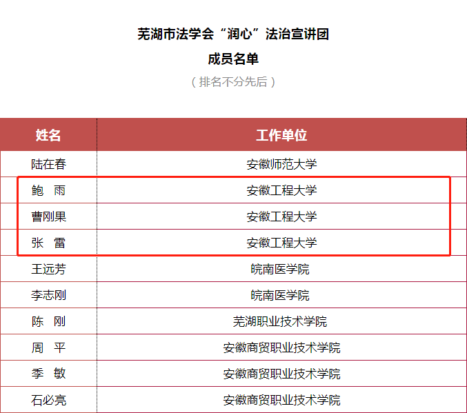 本网讯 为深入学习宣传贯彻党的二十大精神,进一步发挥法学专业人才宣传宪法法律知识、服务法治实践的重要作用,推动全民普法工作走深走实,芜湖市法学会牵头成立了“润心”法治宣讲团。我校人文学院法学系鲍雨、张雷、曹刚果三位教师经个人申请、单位推荐、市法学会审核,入选为芜湖市法学会“润心”法治宣讲团成员。