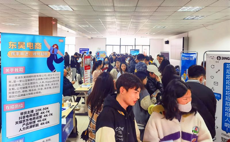 杭州源骏实业、上海拜伦文化传媒、南京宁萌动漫科技、安徽美仑教育、杭萧钢构(安徽)有限公司、芜湖城东少年宫、芜湖外经等30余家公司应邀参加招聘。企业单位涵盖上海、南京、杭州、安徽等长三角地区多个城市。招聘会现场,毕业生们就感兴趣的单位和岗位仔细询问相关信息,积极递上精心准备的个人简历,与用人单位进行充分交流。各企业代表从公司未来职业规划、行业前景、业务范畴、岗位职责、薪资福利和晋升空间等方面向前来咨询的同学们进行详细的介绍,双方沟通坦诚、气氛十分融洽。参加完招聘会的体育表演191班的李登伸表示,很高兴能在校园里参加属于我们自己的大型专场招聘,感谢学校为我们提供了与企业面对面交流的机会。参会企业对本次招聘会的组织和服务表示非常满意,对三个学院毕业生的综合素质表示认可。