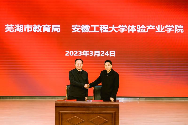 芜湖市教育局与体育学院体验产业学院签署合作协议。王晓燕、伍小平、胡好、吴友义、薛保红等为芜湖市第二中学、芜湖荟萃中学、安徽师范大学附属外国语学校城东校区、芜湖市澛港小学“新时代实践教育创新博士工作站”揭牌。