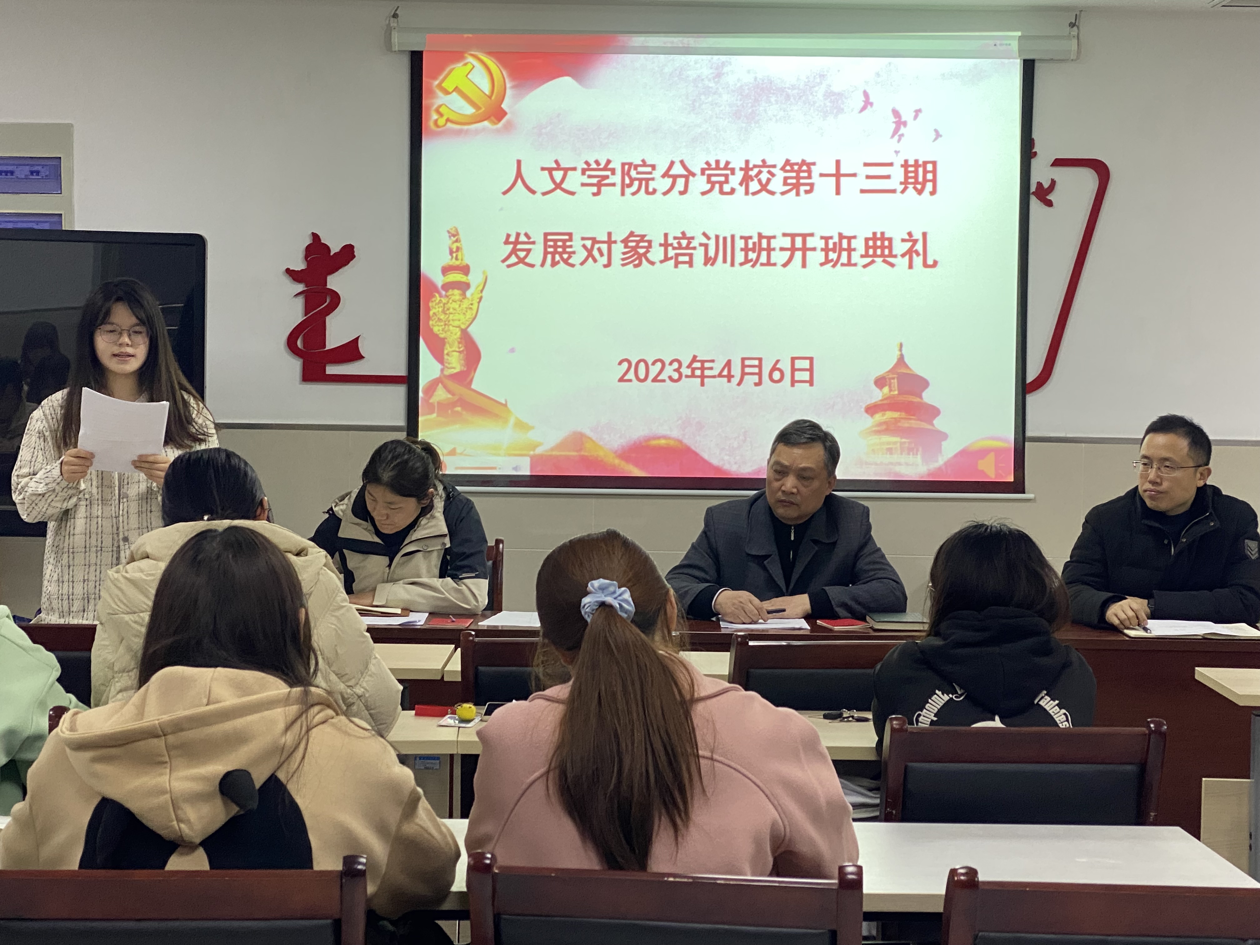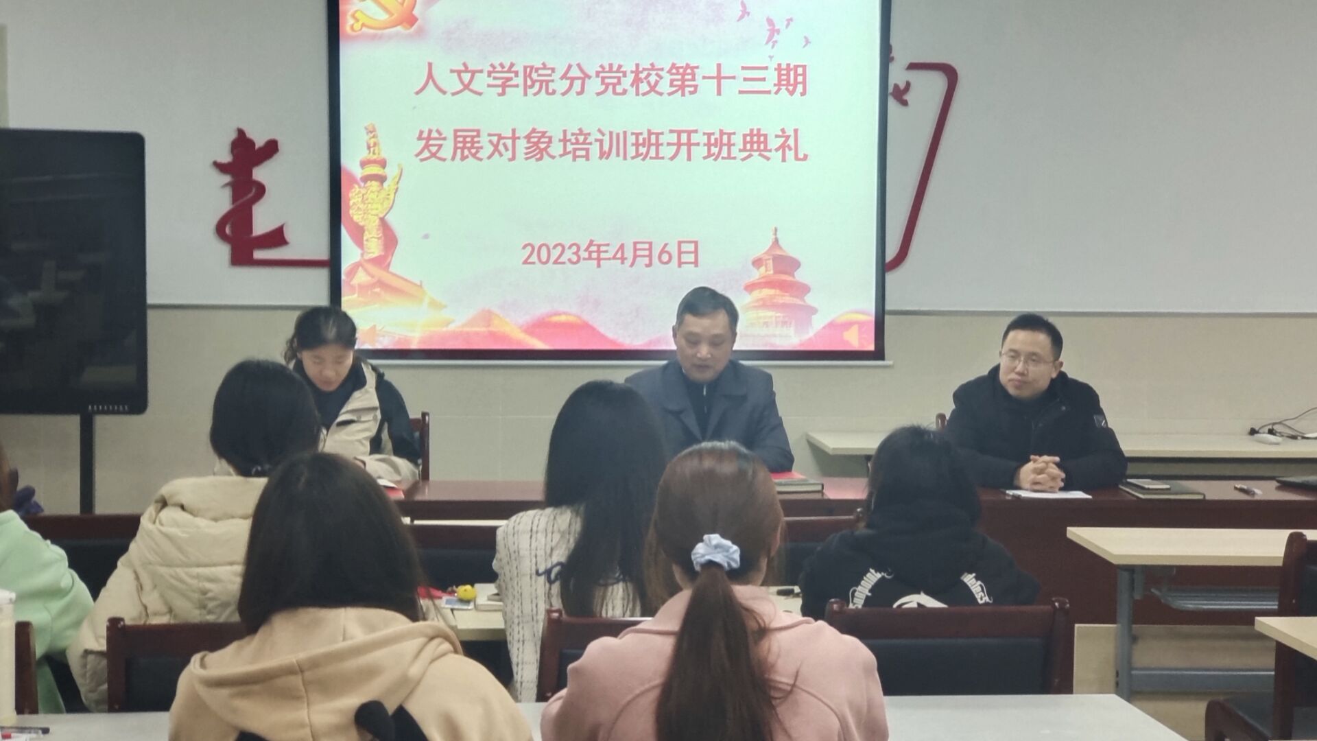 本网讯 为深入学习贯彻习近平新时代中国特色社会主义思想和党的二十大精神,根据《中国共产党发展党员工作细则》《安徽省普通高等学校发展党员工作实施细则》,落实“三抓”“三全六专”工作要求,使发展对象进一步加深对党的基本知识的理解掌握,坚定理想信念,人文学院分党校第十三期发展对象培训班于4月6日在学院1415会议室举行开班典礼。人文学院党委书记邓英扣、党委副书记王中江、班主任李娜以及本期培训班全体学员参与此次开班典礼,开班典礼由王中江主持。
