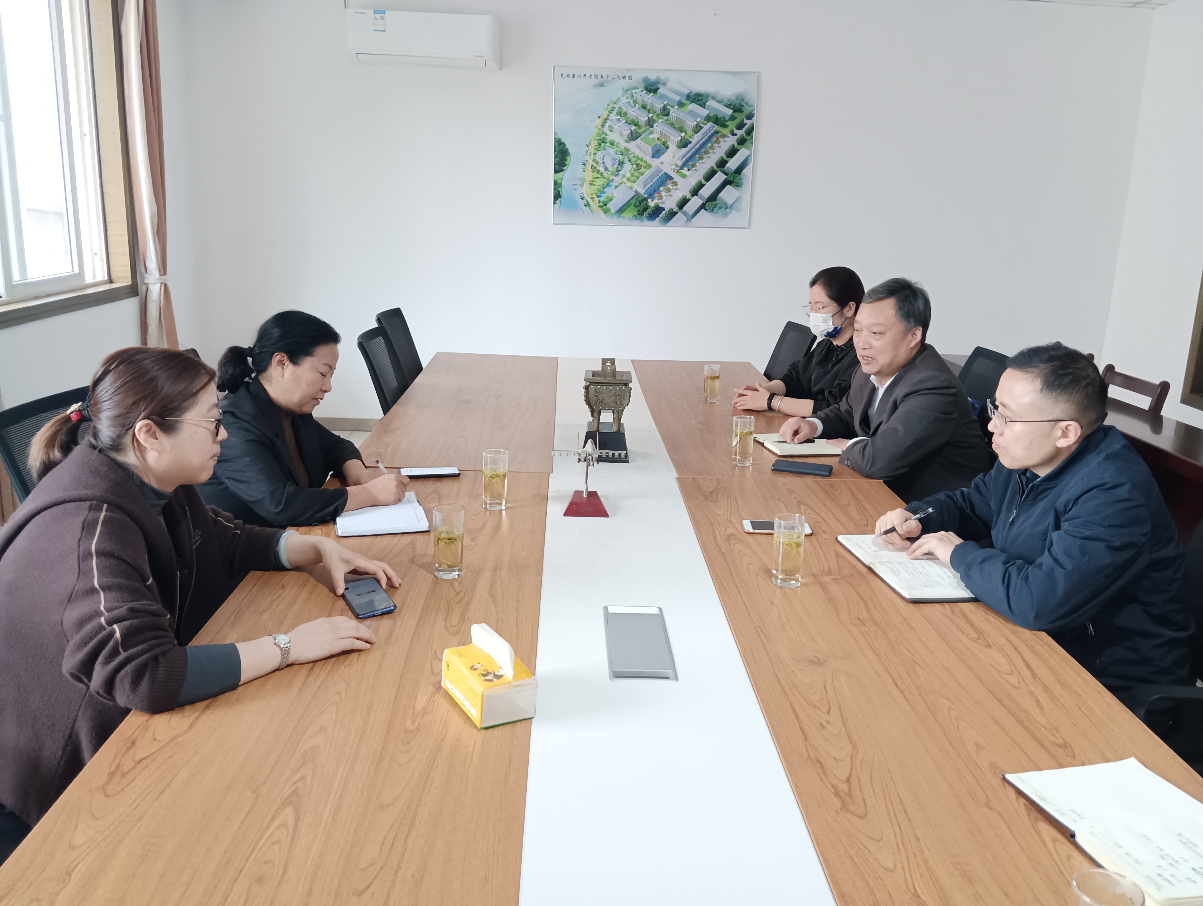 在湾沚区芜湖乐摘生态农业园,企业负责人陈源源热情接待了邓英扣一行,详细介绍了企业的理念、发展思路、运营模式;在镜湖区康怡养老中心,负责人夏静向邓英扣一行介绍了当下养老的发展状况、公司的发展目标、下一步的规划打算。
