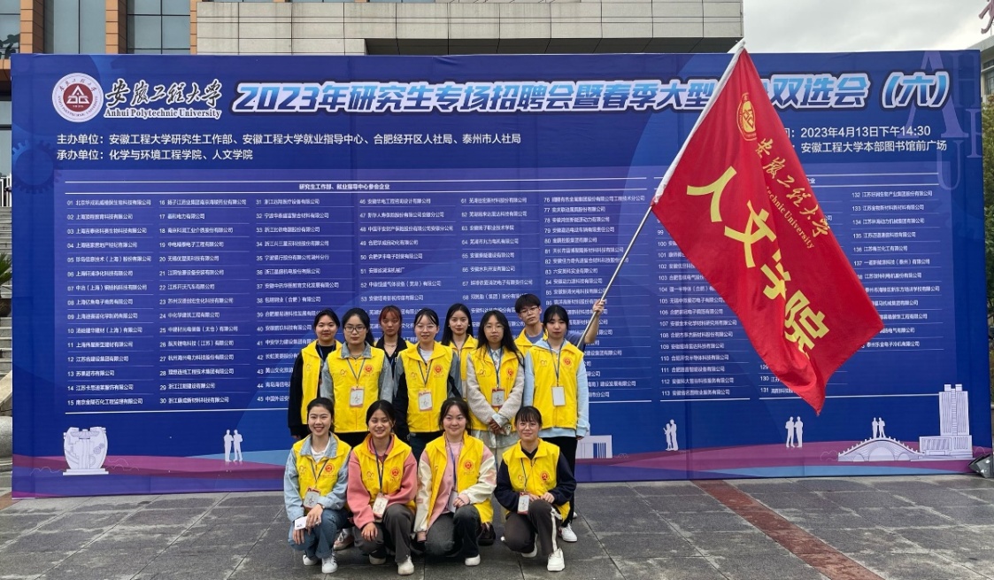 本网讯 为深入学习贯彻党的二十大精神,全面落实党中央、国务院对高校毕业生就业创业工作的决策部署,4月13日,安徽工程大学研究生工作部、安徽工程大学就业指导中心、合肥经开区人社区、泰州市人社局,在校本部图书馆前广场主办2023年研究生专场招聘会暨春季大型综合双选会。人文学院作为此次研究生专场招聘会承办单位之一,积极组织“阳光之旅”青年志愿者服务队开展志愿服务工作,以实际行动为本次招聘会助力护航。