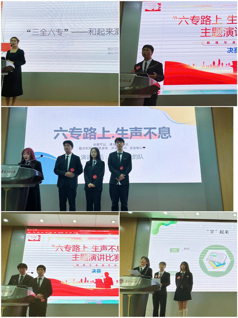 本网讯 为展示新时代青年朝气蓬勃、奋发有为的精神面貌,4月13日,数理与金融学院在5教117举办“六专路上·生声不息”主题演讲比赛决赛。校党委巡察办秘书苏燕南、学院辅导员担任评委,统计211班何运鸿主持活动。本次演讲比赛经历了宣传发动、自主报名、班级初赛、年级复赛四个阶段,近百位学生参与,最终八支队伍脱颖而出,顺利进入决赛。比赛旨在锻炼学生语言表达能力以及临场发挥能力,动员更多同学积极参加学校“三全六专”育人实践。