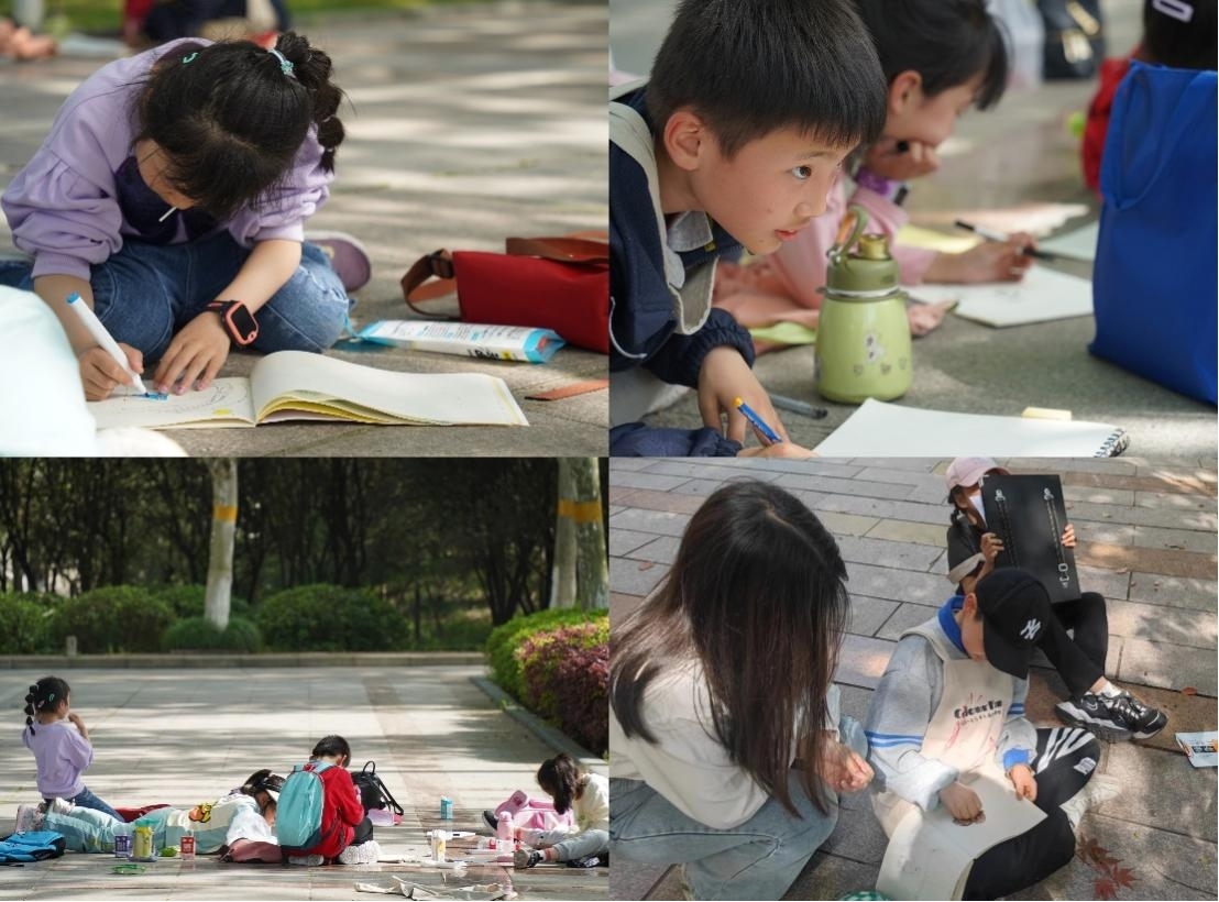 小组成员开展了观影、手绘明信片、寄语成长、趣味写生等活动,引领学生在健康向上的审美实践中感知艺术、体验艺术,逐步提高感受美、欣赏美、创造美的能力,从而产生内驱力,提升美育素养。在趣味写生活动中,小朋友们拿着画笔在设计学院楼前挥洒春日美景,记录绣球花的迎风舞动,渲染湖水的片片涟漪,抑或是在师生活动中心旁描摹雕塑,听志愿者讲述作品《收获》的故事。