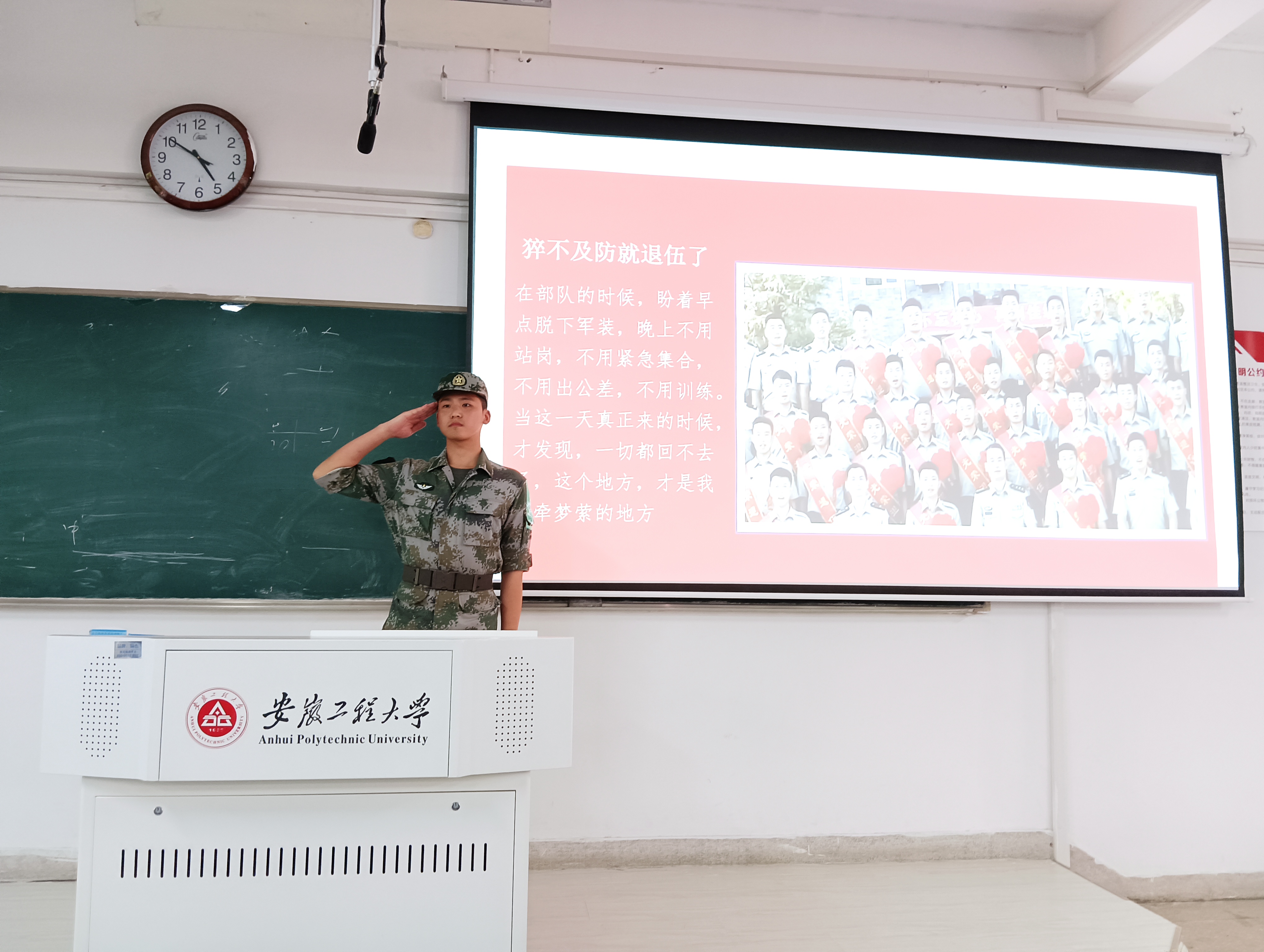 王九香和董云翔两位退伍大学生从自身经历出发,分享了由学生成长为优秀士兵的心路历程,从追逐梦想、军营生活、奋斗青春等方面,讲述了自己在部队的点滴故事,并表示应征入伍不仅锻炼了坚强的意志、炼就了强健的体魄,更使他们懂得了感恩父母、感恩学校、感恩国家,鼓励大家让青春在部队闪光、让梦想在军营绽放。