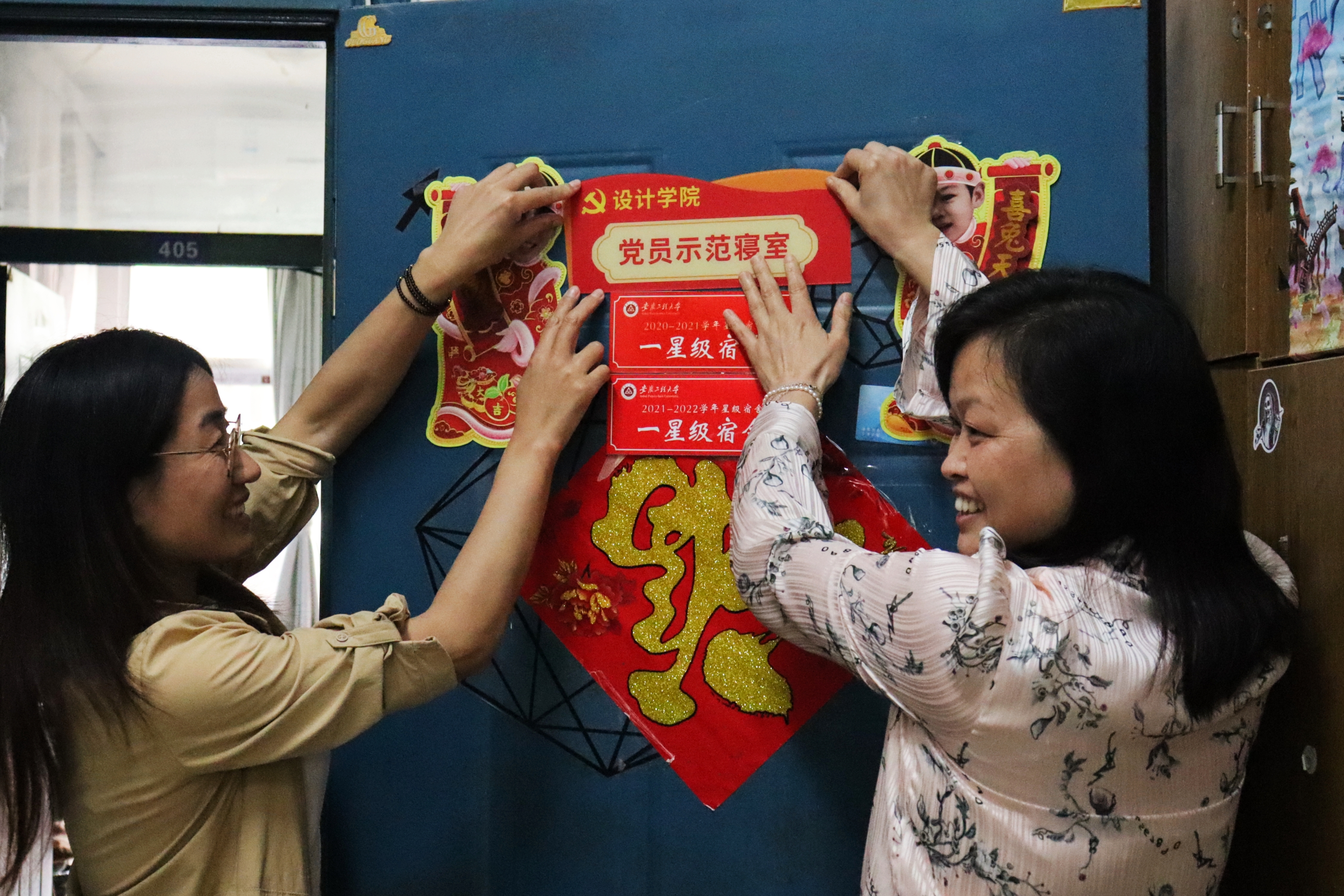 设计学院把党建领航作为“三全六专”育人实践向班级和宿舍延伸的工作导引,从宿舍建设的小切口来书写党建引领的大文章,激励全体学生党员、入党积极分子亮身份、做表率。为党员宿舍、党员和入党积极分子铺位挂牌,有效推动了党建工作“进楼入室”,做实了党建领航和育人实效,激励和督促全体学生党员和入党积极分子时刻牢记身份,在文明寝室建设的场域中发挥先锋模范作用。