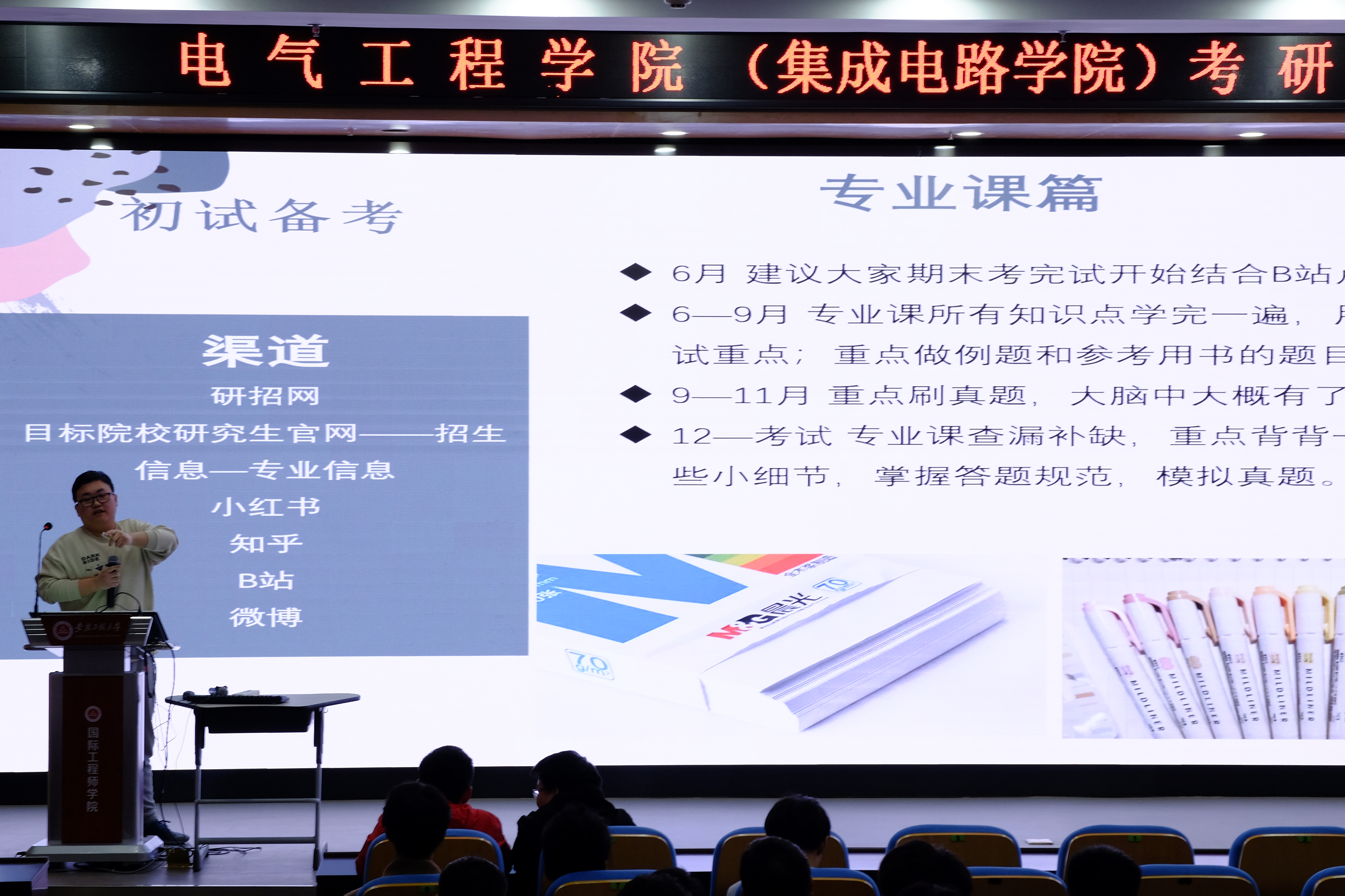 为了提高考研备考的针对性,此次分享会按照专业类别分为强电(自动化、电气、建电)和弱电(电子、电科、通信)两场进行,受邀分享考研经验的2019级考研优秀学生代表依次与同学们分享自己的考研心得和成功经验。他们以自身考研经验为例,从考研动机、院校选择、资料收集、网课选择、学习方法、计划安排、复试技巧、心态调整等方面作了详细介绍。内容生动有趣,会场气氛温馨热烈,与会同学纷纷表示收获颇多。