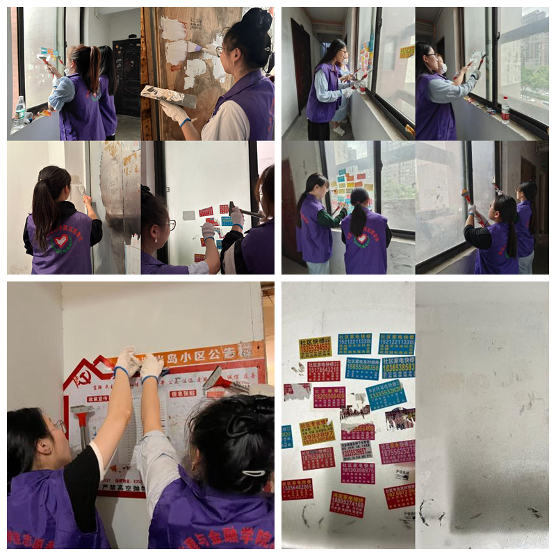 志愿者们在社区工作者的带领下,拿着小铲、喷壶等清洁工具,走向社区的角角落落,决心彻底清理小区楼道、墙面、公共设施等乱张贴的“小广告”,还社区居民一个整洁优美、文明有序的居住环境。面对粘贴牢固、不易清理的小广告,志愿者们不怕脏、不怕累,用手一点一点撕或者拿铲子使劲地铲,想尽各种办法将顽固广告撕离墙体。一会儿工夫,志愿者们动作越来越娴熟,小广告便被大家铲除得干干净净,恢复小区最初干净美好的面貌。