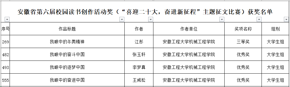 本网讯 近日,由安徽省教育工委、省教育厅、省人力资源和社会保障厅、省文化和旅游厅、省新闻出版局、团省委共同主办的安徽省第六届读书创作活动评选结果公布,学院从宏超老师撰写的征文《我们这十年》荣获一等奖,一名学生荣获三等奖,三名学生荣获优秀奖。