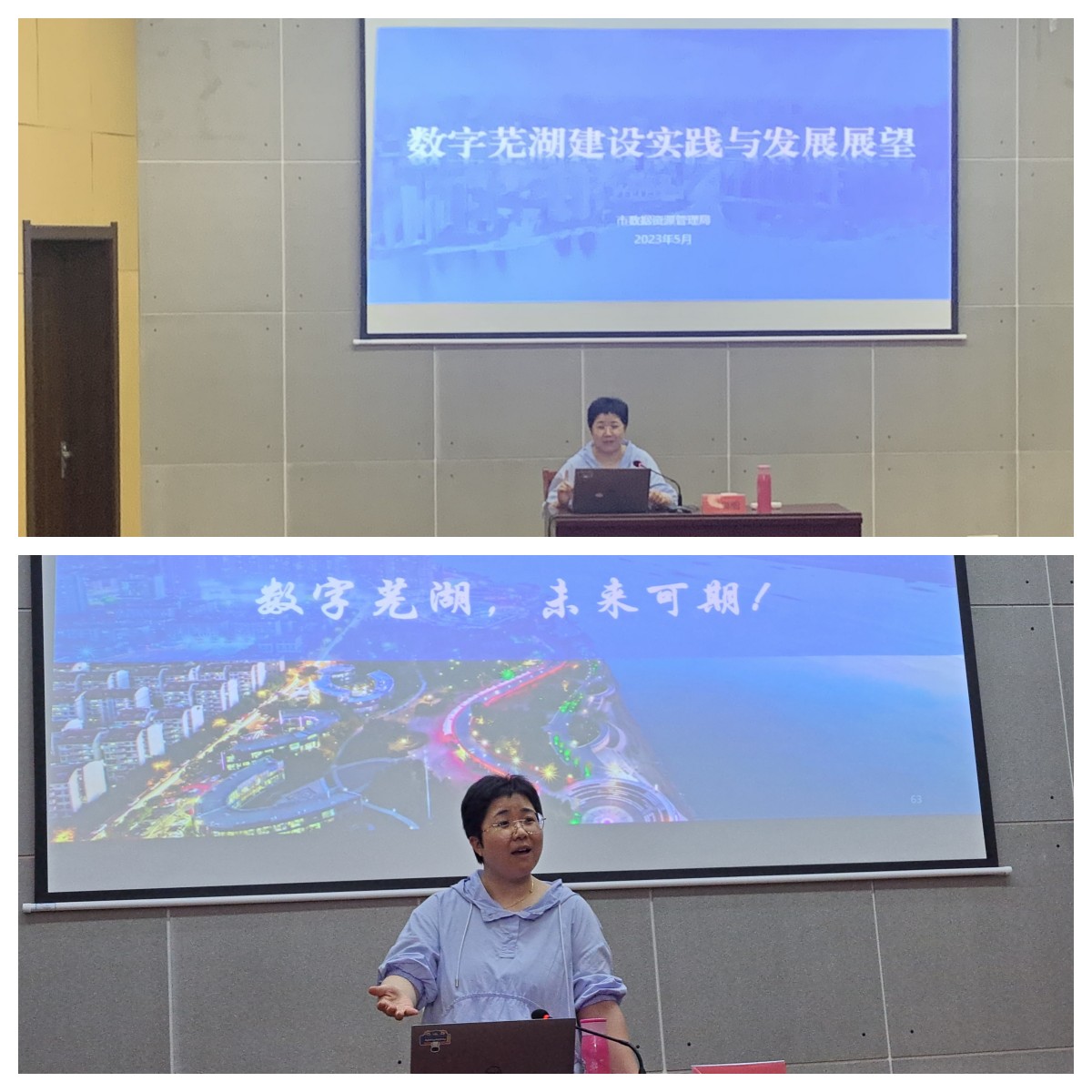 会后,刘福丽在学院5楼报告厅向学院师生作“数字芜湖实践路径与发展展望”主题报告。本次报告以街道、开发区和市直部门三级机构的实践经历为切入点,深入探讨数字城市建设的实践经验。报告内容涵盖信息基础设施建设、数据资源采集、汇聚与治理应用,以及各行业的数字化转型应用等方面。尤其重点展示芜湖市城市大脑生态体系建设的应用情况,探讨其对数字城市建设的启示和借鉴作用。报告的最后,刘福丽对数字安徽战略进行解读,对数字芜湖未来的发展前景进行展望和分析,以期为数字城市的理论和实践研究提供有益的参考。