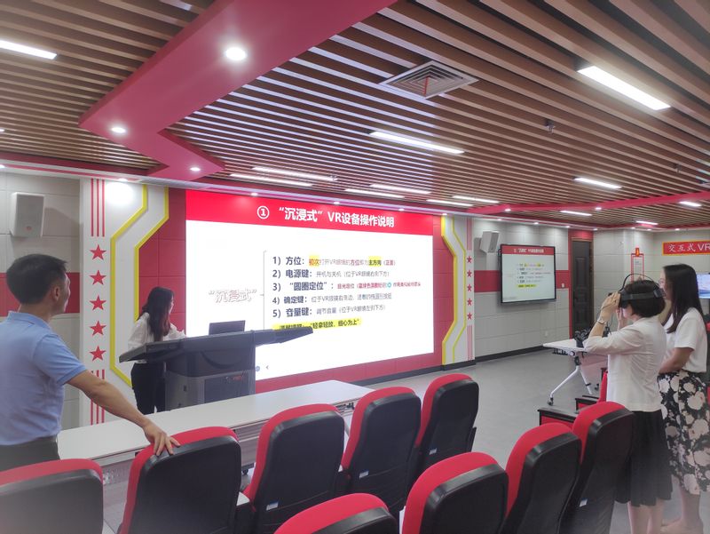 会后,与会人员一同参观了思政课VR虚拟仿真实践教学中心,王晓琳一行体验了交互式VR虚拟仿真实践教学设备。