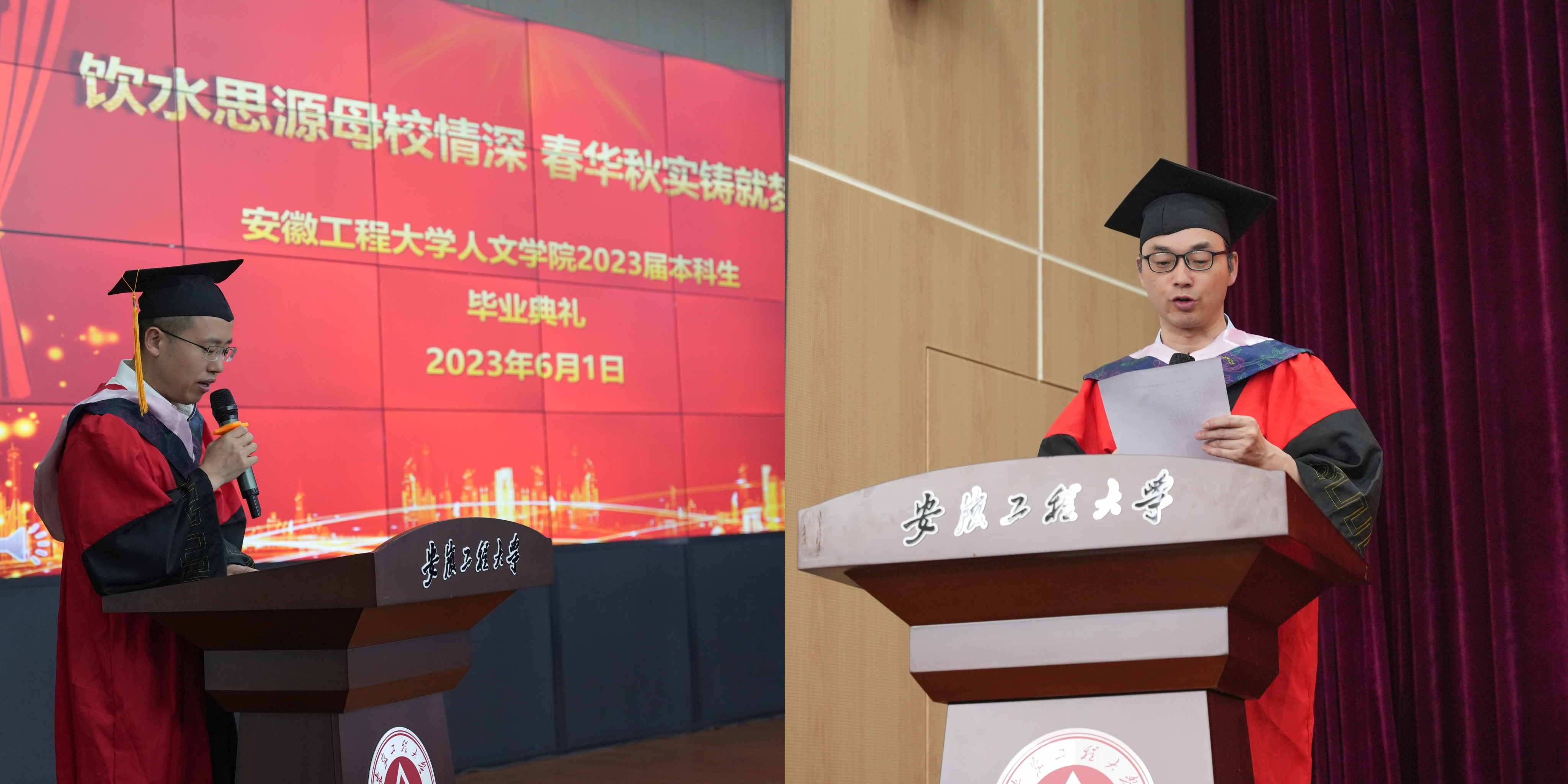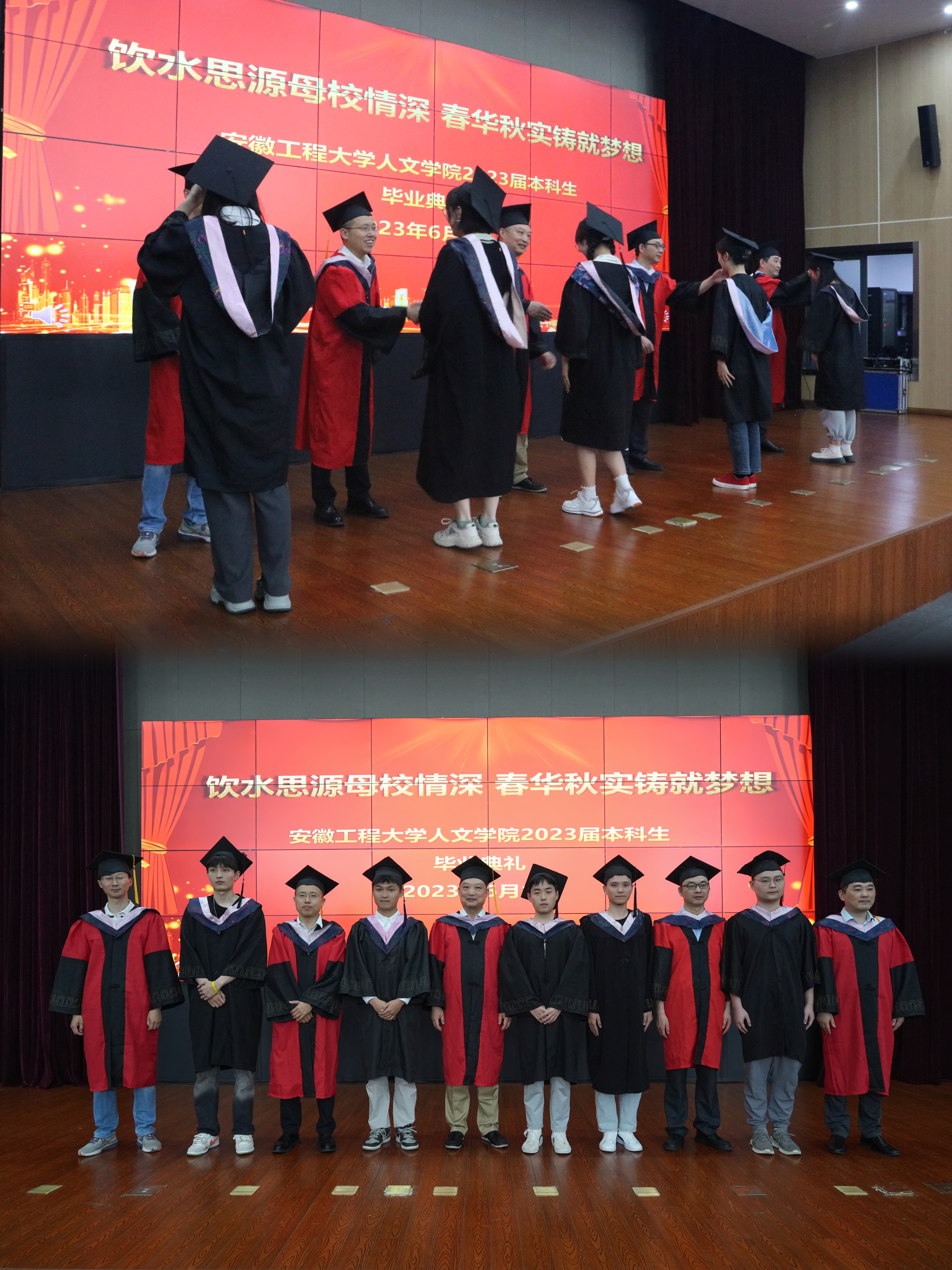 学院党委副书记王中江宣读《安徽工程大学2023届人文学院优秀毕业生》名单,院长刘军宣读《人文学院2023年安徽省优秀毕业生》名单。最后学院党政领导为每一位毕业生扶正流苏,并合影留念。帽穗从右边拨到左边,见证着学子们的成熟、成长、成才。在热烈的掌声中,人文学院2023届本科生毕业典礼落下帷幕。