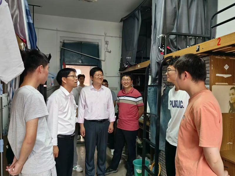 在男生22#和25#毕业生宿舍,经济与管理学院党委书记水心宝代表学院向毕业生致以问候和关怀,并与毕业生亲切交谈。“毕业典礼参加了吗?感觉怎么样?”“工作都确定了吗?”“打算哪天回家?”“有没有什么想对学院说的话?”走访过程中,水心宝表达了对同学们顺利毕业的祝贺、对同学们四年以来始终支持学院工作的感谢,同时结合国家的发展,鼓励同学们在第二个百年奋斗目标中继续努力,实现精彩人生。经济与管理学院党委副书记刘海涛、副院长桂云苗就学生毕业就业去向、离校时间、生活近况、未来打算等情况进行询问,并鼓励毕业生留爱母校,站好最后一班岗,以实际行动展现经管学子的良好精神面貌。他们深情寄语,希望同学们能够牢记老师嘱托,不忘同窗友谊,常回母校看看,经济与管理学院永远是他们的家。
