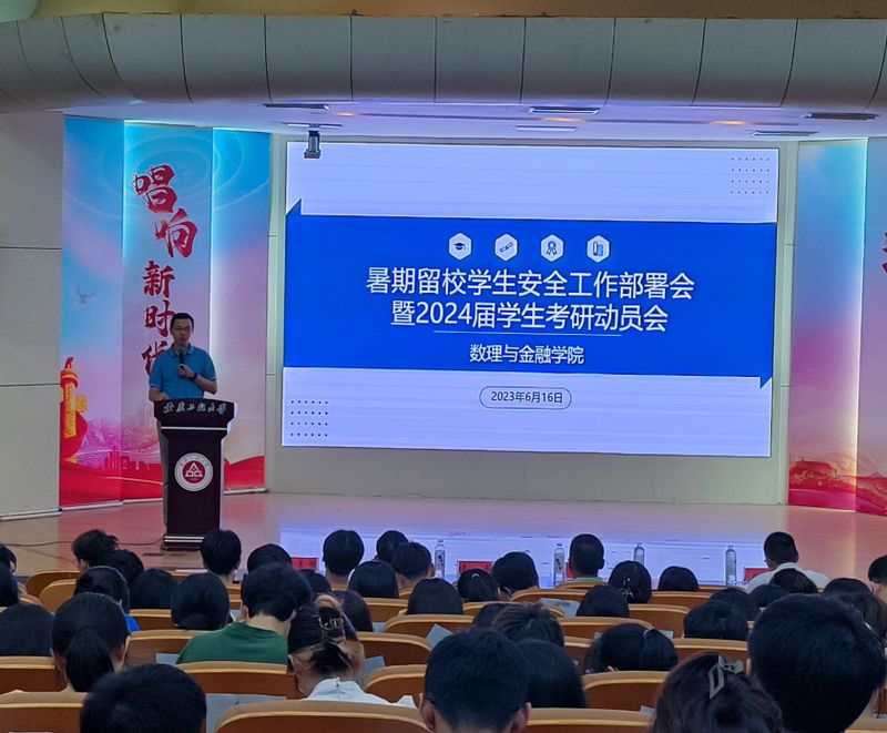 本网讯 为切实加强暑期留校学生安全教育和管理,增强留校学生安全防范意识,做好2024届学生考研指导和动员,6月16日,数理与金融学院在学术报告厅召开暑期留校学生安全工作部署会暨2024届学生考研动员会。学院党委书记周毅仁,党委副书记、院长吴小太,副院长张培雨,副院长潘海峰,相关辅导员以及全体暑期留校本科生和研究生参加会议。会议由学院党委副书记、纪委书记何志恒主持。