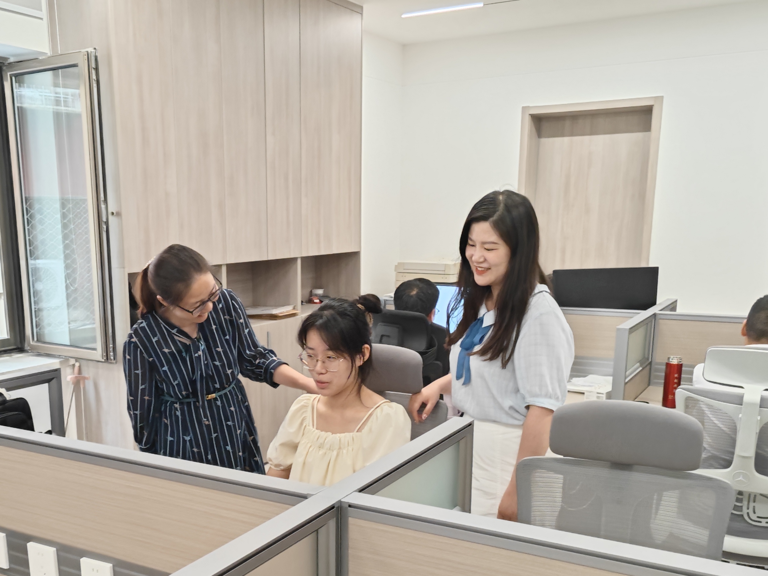 调研中,彭海燕一行看望了毕业生祁璐、葛佳音等4名同学,详细了解了学生的工作生活情况,她鼓励同学们要加强自我管理、重视自主学习,踏实努力工作,并嘱托同学们要严格要求自己,遵守企业规章制度,将所学理论和技能用于实践工作中,不断提升职业素养与自身素质。