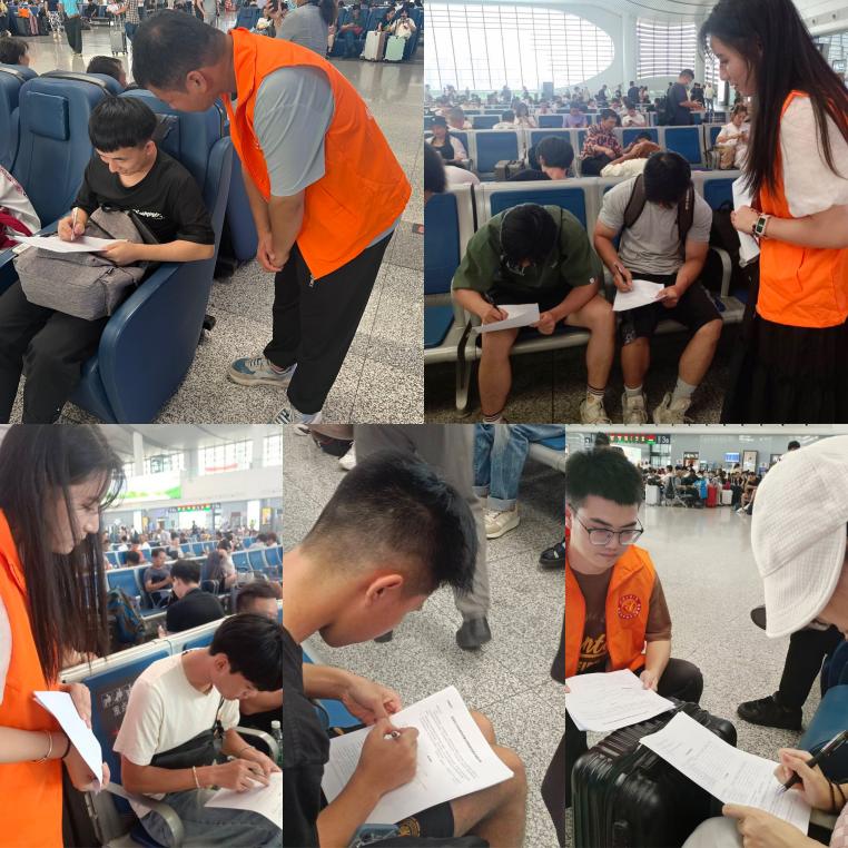 团队穿梭于售票厅、候车大厅、进站口、出站口等区域,对车站的安全性、功能性和便民性进行调研考察。通过与工作人员的交流,团队了解到暑运以来,学生、旅游客源集中释放,出行需求主要以旅游度假、对公商务、探亲访友为主,车站不断迎来客流高峰。如何在满足乘客出行需求的前提下,有效提升车站的客运能力、服务品质,从而应对暑运客流高峰、确保暑期乘客运输工作安全有序是团队思考的问题。团队来到候车大厅,向不同年龄段的乘客发放车站服务质量及乘客服务需求调查问卷,并对候车乘客进行了采访。调研过程中,共发放收集调查问卷100余份,团队成员认真记录并耐心地为乘客答疑解惑、提供帮助,收获了乘客对于本次实践活动的肯定、赞扬以及宝贵的建议。