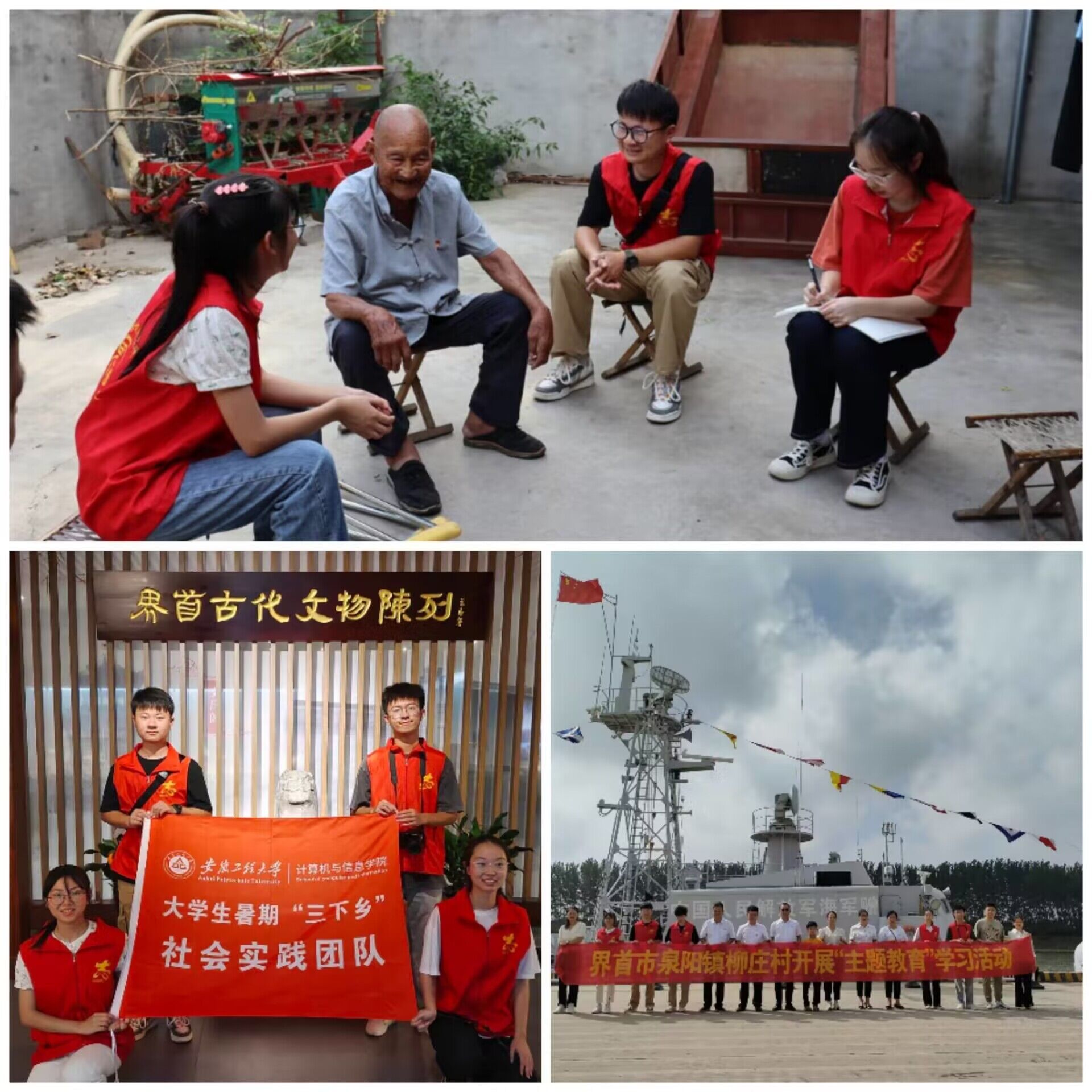 团队成员开展“强国有我,青春有为”研学活动,通过学习党的二十大精神、习近平总书记系列回信等主要内容,帮助同学们认识到此次活动重要性,统一思想,统一意志,凝聚团队合力。团队还来到90岁抗美援朝老兵尚金贵家中,送上慰问和祝福。当谈及入伍的初衷时,尚金贵表示国家兴亡,匹夫有责,他殷切嘱咐学子们在追求卓越的道路上,以至善至美为目标,为祖国的繁荣昌盛贡献才智、力量。智愿舞梦小分队还与柳庄村干部一同前往界首市国防教育园区开展主题教育学习,近距离感受进入香港履行防务使命的英雄艇,聆听保卫香港、维护国家主权的舰艇故事,深刻感受“勇当先锋、敢于胜利”的“海上先锋精神”,增强了民族自豪感和自信心,激发了青年学生担当作为干事创业的积极性。