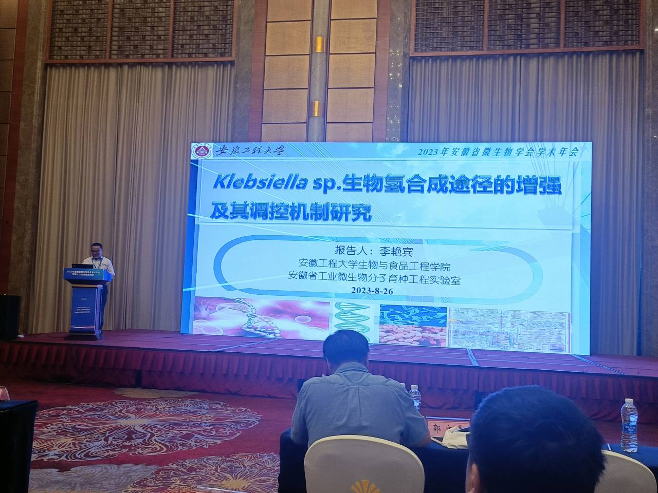 近年来,学院老师逐渐彰显较高学术水平以及学术地位,多名老师在大会上作学术报告并担任年会重要职务。张会敏在“2023草原生物质学术论坛”大会上作“浓香型白酒新老窖泥菌群、理化性质差异分析及其人工改良研究”学术报告;郑淑娟老师在“第三届中国经济林协会经济林产品加工利用研讨会暨第五届中国•新疆(兵团)特色农产品加工技术战略研讨会”上作“橄榄苦苷对小鼠晚期2型糖尿病的改善作用研究”学术报告;李艳宾老师在“2023 年安徽省微生物学会学术年会暨第七次会员代表大会 ”上作“Klebsiella sp. 生物氢合成途径的增强及其调控机制研究”学术报告并担任学会理事。刘艳老师参加了“2023安徽省生物医药产业及疾病模式动物高峰论坛暨安徽省生物工程学会年会”并担任生物工程学会年会常务理事。
