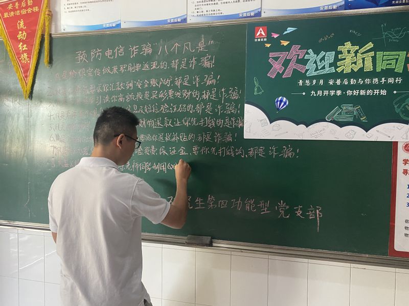研究生宿舍功能型党支部向每一位新生发放防诈宣传单并结合身边真实的案例,以案说法,宣传防诈骗知识,叮嘱新生警惕上门推销。其中,研究生宿舍第四功能型党支部制作了防诈骗黑板报。研究生宿舍第一功能型党支部还结合本学院专业的特点开展食品安全科普宣传活动,将食品安全前沿问题印刷在宣传单上,发放给每一个新生和老生,启发研究生们关注食品安全,健康成长成才。同时,发放致家长的一封信,加强家校联系,形成家校教育合力。