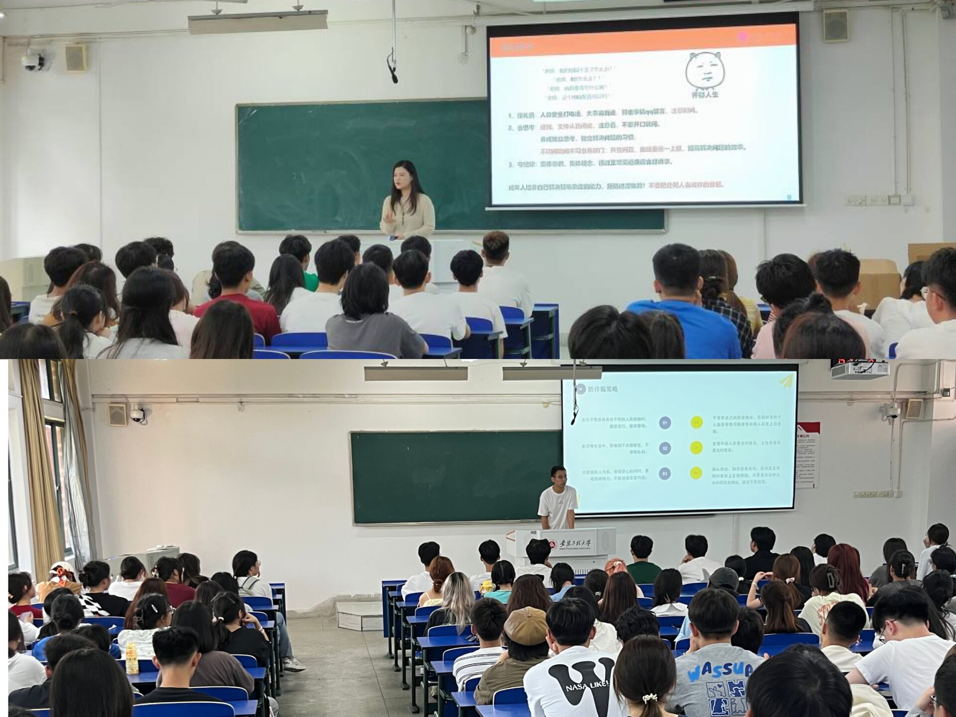 新生辅导员田潇濛、徐超主持召开了以“陪伴是最长情的告白”为主题的第一次班会。两位老师开展了新生适应性教育、职业规划教育、防诈骗教育,并着重介绍了2023级《学生手册》相关内容,教育引导同学们进一步树牢了安全意识、树立了自身的长远目标。新生同学们纷纷表示将以热情饱满的精神状态迎接接下来的大学生活。