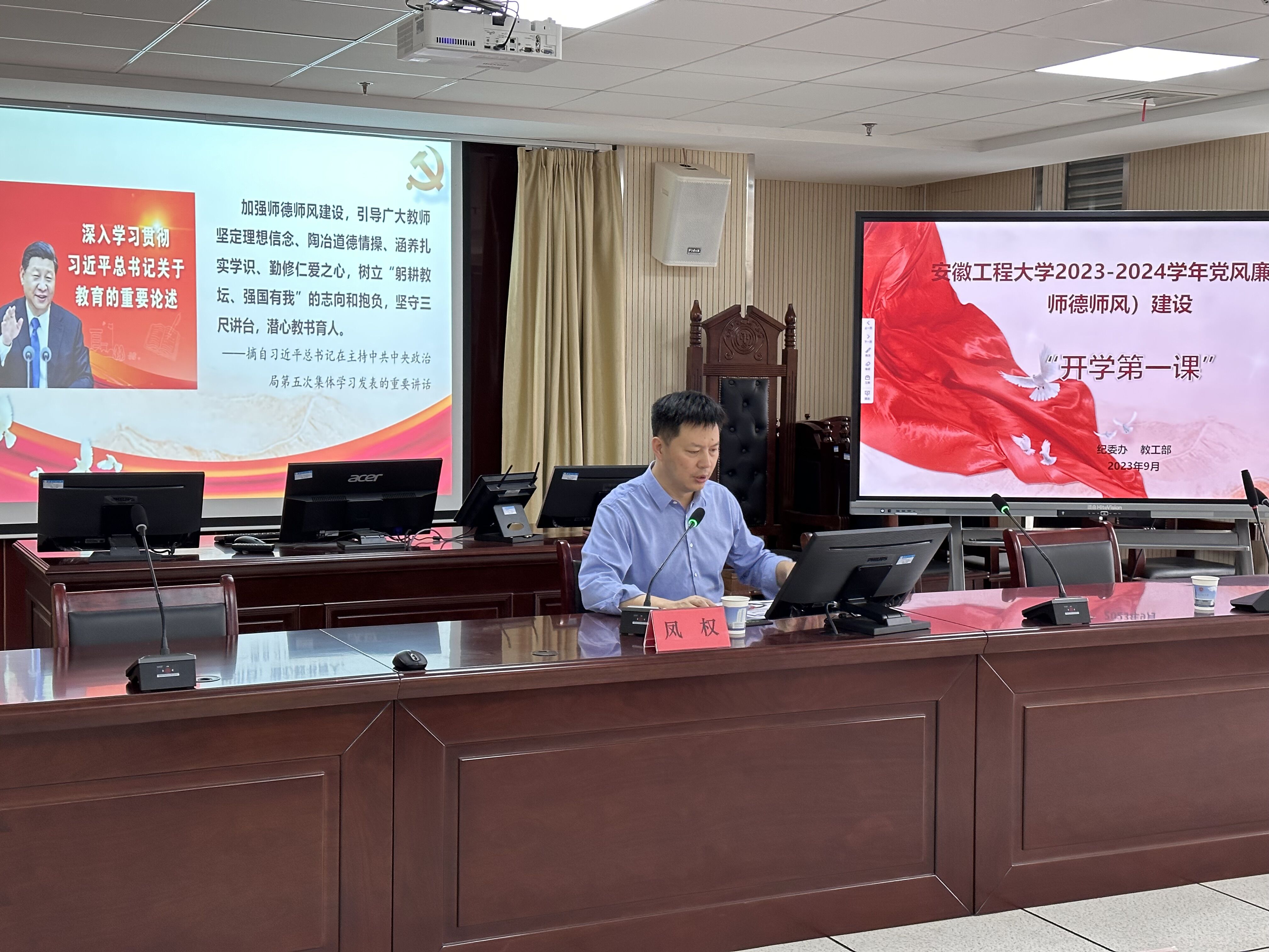 本网讯 9月13日,校党委常委、副校长凤权来人文学院作党风廉政(师德师风)建设“开学第一课”专题报告。学院党政领导班子、全体教职工参加报告会,学院党委书记刘一主持会议。