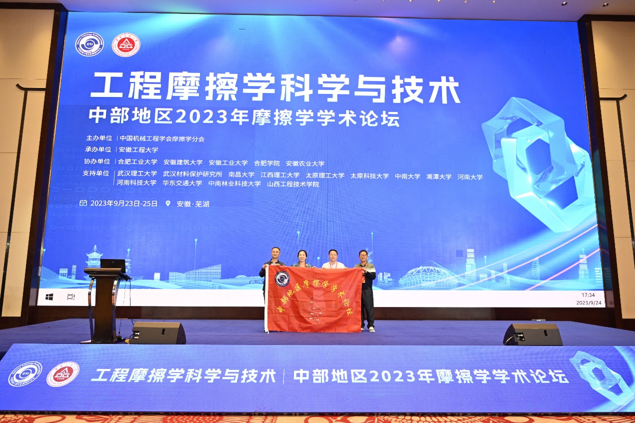 闭幕式上,为优秀口头报告获得者、论坛优秀墙报获得者颁奖。合肥工业大学摩擦学研究所所长王伟教授将中部地区摩擦学学术论坛旗帜移交给下一年承办省份江西省的参会代表。