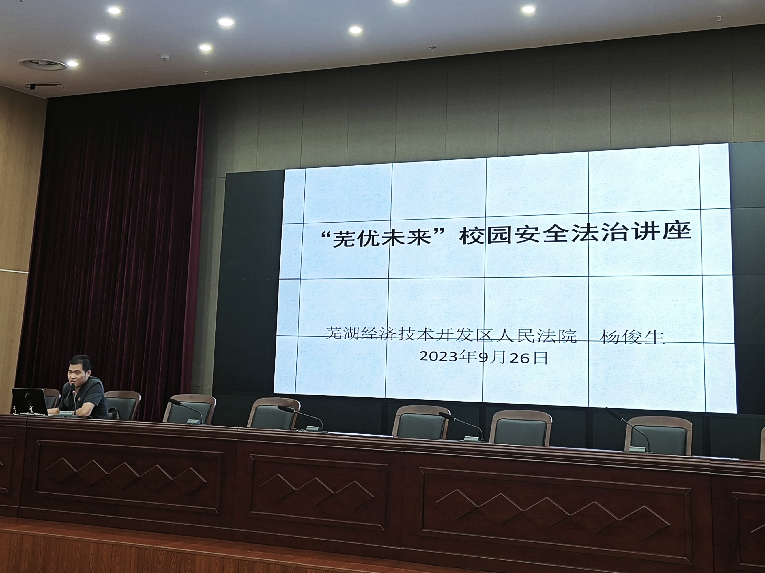 本网讯 为进一步加强大学生法治教育,加大校园防诈骗宣传力度,普及反诈骗知识,增强学生的法治观念和安全防范意识,9月26日晚,学校聘请的“法治辅导员”、芜湖经开区法院民事审判庭副庭长杨俊生法官走进安徽工程大学开展法治教育及反诈骗知识宣传讲座,教育引导学生提高识骗、防骗能力,共同筑牢反诈防护墙。设计学院党委副书记彭海燕、学院新生辅导员、2023级全体新生参会,彭海燕主持报告会。
