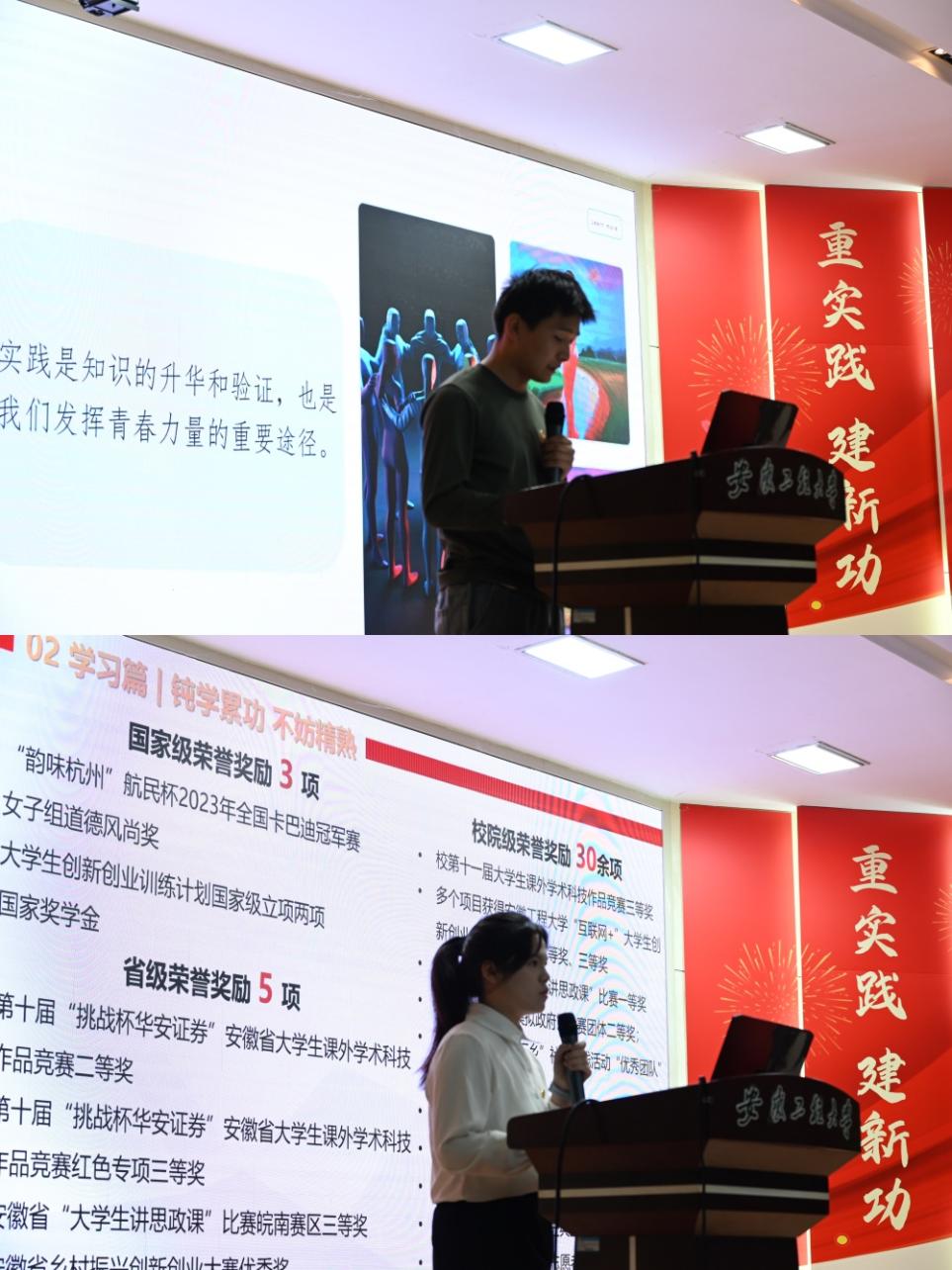 优秀团员青年代表开展先进事迹宣讲活动。法学222孙中乐进行《青春力量,在“知”在“行”》主题宣讲,结合自身参军入伍经历,建议新生注重知行合一,在学习中成长,在实践中探索真理。行管212陈轶嘉进行《踔厉奋发担使命,赓续前行向未来》主题宣讲,结合自身在校学习获奖情况、参加社会实践经历、担任团干部经历,激励新生奋发学习、增长才干、创造美好未来。