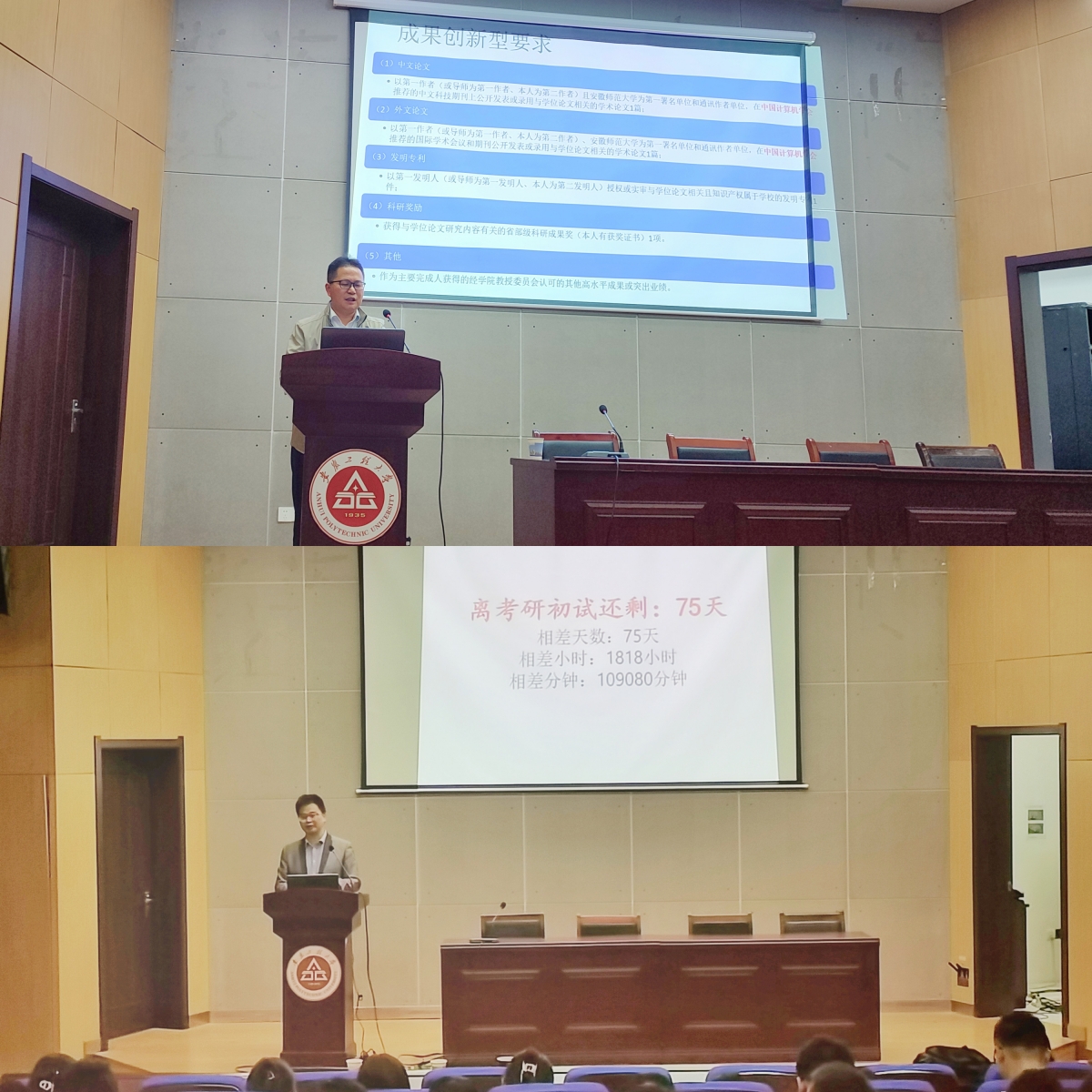 本网讯 为帮助学生充分了解当前考研形势,引导学生明确定位、树立目标,同时帮助同学们解决在考研中遇到的难题,10月8日,计算机与信息学院在C座五楼报告厅召开考研辅导会,邀请安徽师范大学计算机与信息学院副院长陈付龙和学院副院长王勇做辅导报告,会议由学院副院长刘涛主持,毕业班辅导员和学院准备考研学生参加会议。