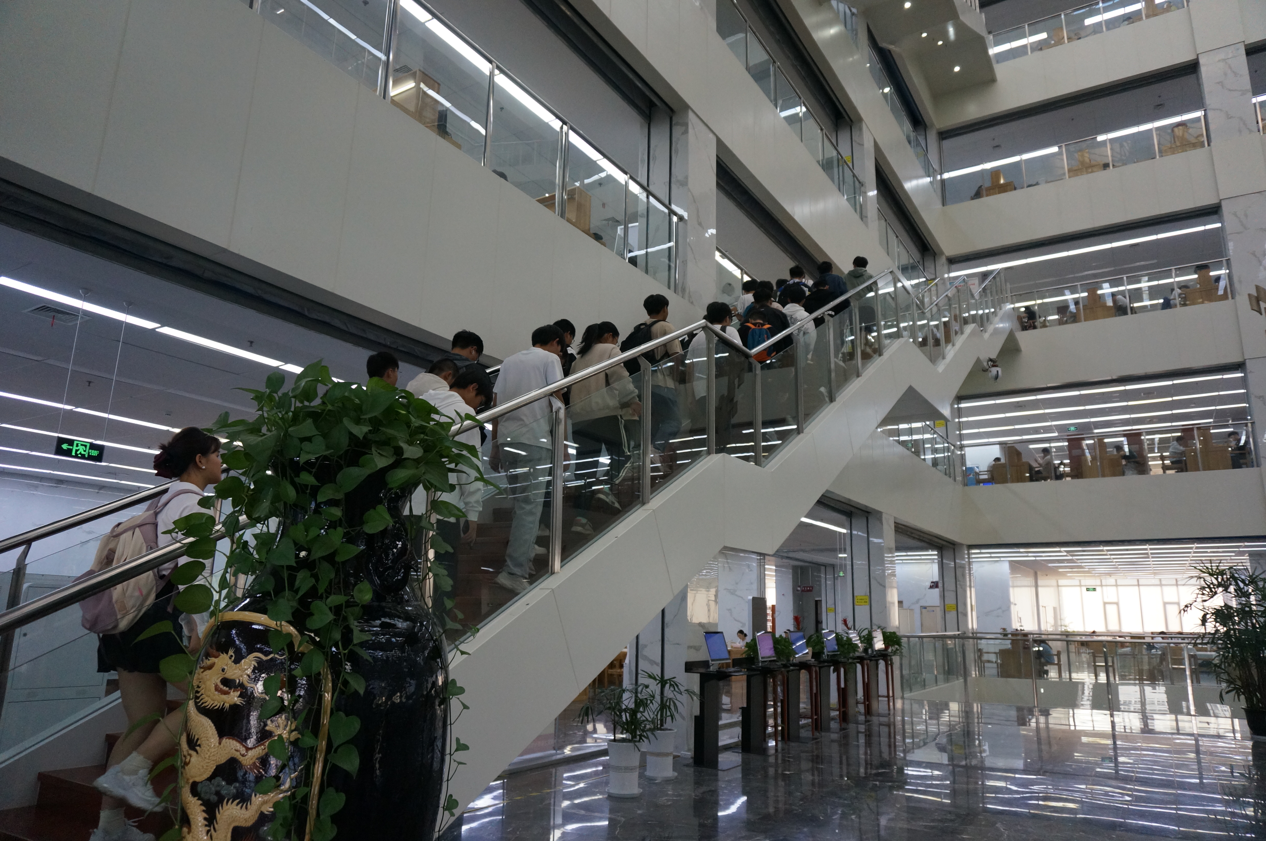 本次迷“图”之旅设有两个活动,活动一为集齐印章自助参观图书馆。这个活动需要2023级新生到总服务台咨询台领取参观卡片,并在规定日期内到图书馆各个服务窗口盖章,自助完成对图书馆的参观;活动二为参观图书馆环节。在图书馆工作人员张耀的带领和讲解下,2023级新生读者完成了对图书馆借阅区及其特色区域的参观。在参观途中,工作人员详细讲解了图书馆的入馆须知、馆藏分布、资源检索方法,图书借阅规则,以及自助借还书机、歌德电子书借阅机等设备的使用。活动最后,参观学生在图书馆多媒体教室参加了限时竞答。