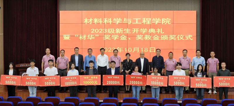 本网讯 10月18日,材料科学与工程学院2023级新生开学典礼暨“材华”奖学金、奖教金颁奖仪式在图书综合楼五楼会议室举行。校党委副书记、校友会会长苏国红,2006届校友、“材华”奖学金、奖教金捐赠人、琥崧科技集团股份有限公司董事长李源林先生,以及社会合作处、研究生部、学生处等职能部门负责人、教学科研关系在学院的相关职能部门负责人、2023级学生家长代表等应邀出席。学院党政班子成员、全体教师、2023级全体本科生和研究生参加典礼仪式。典礼仪式由学院党委书记郭广春主持。