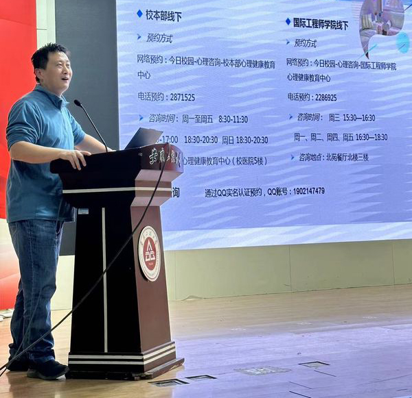 讲座中,杜松涛通过典型案例分析,引出心理健康的概念,介绍了心理健康的特点。他通过对国际卫生组织确立的个体健康十大标准与国内确定的心理健康标准相关政策解读,结合大学生心理健康实际阐述了大学生心理健康标准。他指出刚刚跨入大学学习深造的新同学,容易产生“目标缺失”“思乡心切”等问题,建议同学们树立正确的世界观、人生观和价值观,在积极进取中磨砺意志品质,提高心理素质;学习并掌握一定的心理健康知识,懂得梳理自己的感情,保持积极的情绪状态;树立切合实际的目标,制定合理有序的规划,积极参加集体活动,增进人际交往,建立和谐的人际关系,保持心理健康。