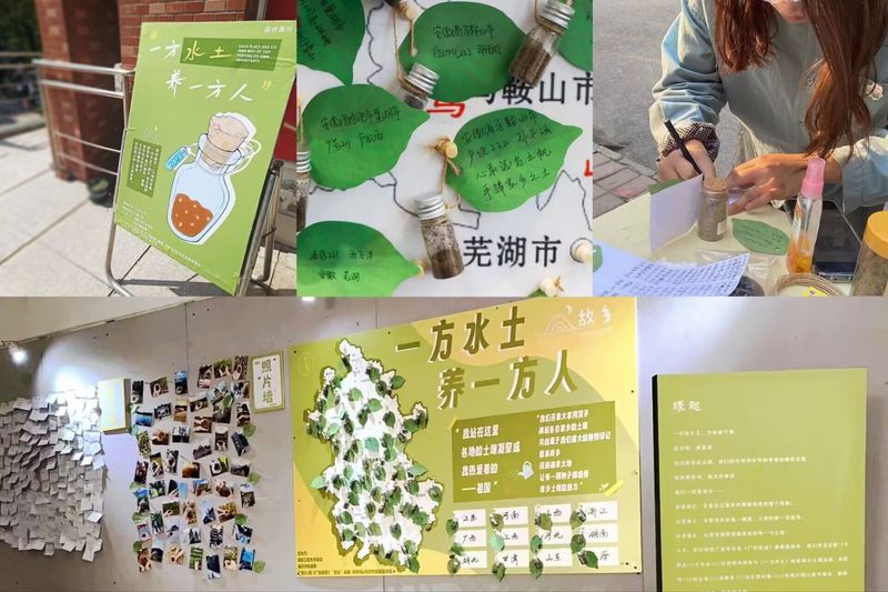校内展览主要由地图、照片墙与留言墙构成,寄托学子们对家乡的情思与祝福。地图上悬挂有省内学子们采集的家乡土壤的瓶子,照片墙上展示的是收集故土的现场照片,留言墙上写有大家对家乡的思念和对未来的期盼。