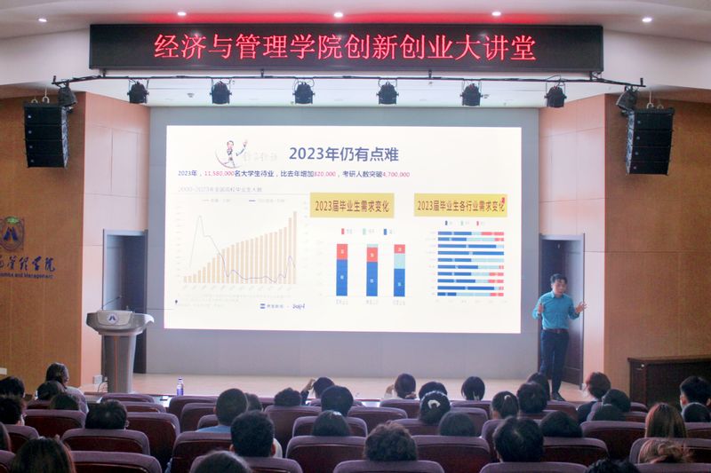 吴锋从分析一段毕业生就业的短视频引出“赢得未来,做一无二的自己”的中心主题。他以2022年和2023年的就业数据状况进行了细致解析,明确指出后疫情时代下毕业生将面临的危机、挑战和就业困难的原因。同时以近几年热门专业薪资上涨,毕业生人数增多等现象向到场学生提出“我们离梦想有多远”的问题,启发同学们思考。围绕这一问题进一步展开,通过详实的社会数据分析,吴锋阐述了“我能做什么远比我想做什么”这一观点的重要作用,他从“重新认识自己、认知职业、认识职场、职业生涯规划设计和自我实现”这五个板块,不断引导学生进行自我认知意识的增强,以及职业认知、职业目标的确认,推进学生在校期间要有更清晰的职业发展规划。报告结束前,他勉励青年大学生只有努力思考,坚持不懈,不断积累,在积累中逐渐完善,最终才能助推自己发生改变。讲座现场,吴锋语言风趣幽默、生动活泼,非常接地气,经济学理论深入浅出,现场互动气氛热烈,令在场师生受益匪浅。