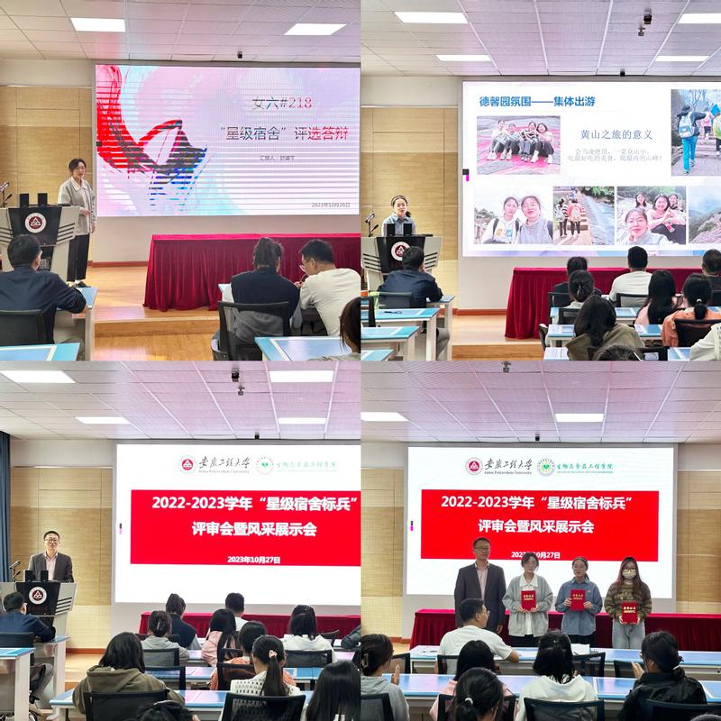 星级展风貌,标兵树榜样,2022-2023学年“星级宿舍标兵”评审暨风采展示会成功举办。经宿舍申报、班级推荐、辅导员审核的来自三个年级的6个实力宿舍,围绕成员风采、宿舍环境、学业学风、特色文化等方面进行展示,分享宿舍成员自入校以来的成长与收获,充分展现了生食学院学子的青春风采。此次评审会共推选出三个星级宿舍标兵参评学校的三星级宿舍评选。生工231吴悦同学观看后说:“学姐们所在的宿舍不负青春、奋发向上,一份份精彩的履历,是她们给自己、给宿舍的一份份完美答卷,更是我今后学习的目标。”