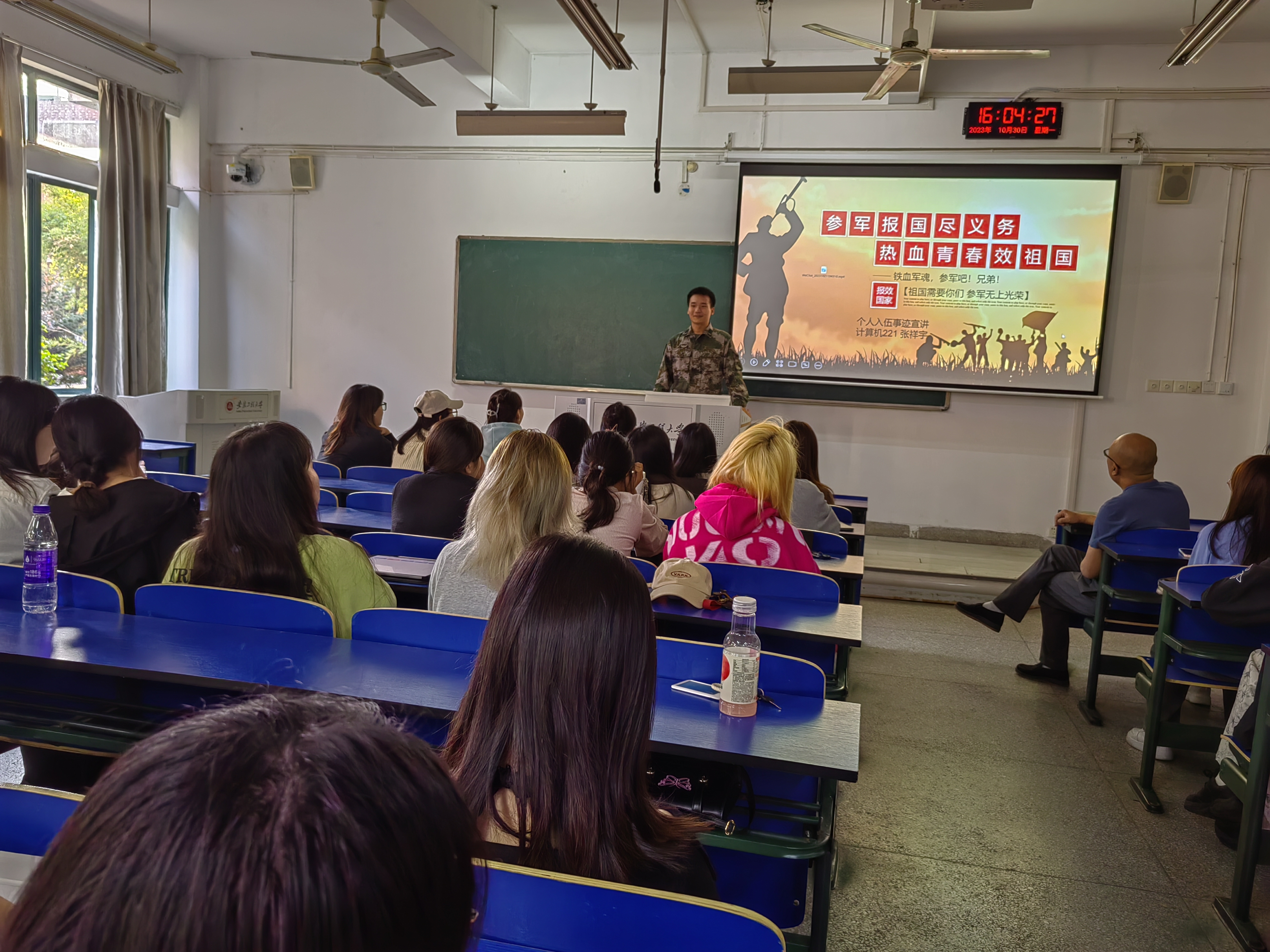 本网讯 “国无防不立,民无军不安。”为深入学习贯彻落实习近平强军思想,认真落实学校“三全六专”育人实践,引导青年学子响应祖国号召到军营建功立业,10月30日,设计学院邀请保卫处赵成婧老师面向2024届毕业生作征兵政策宣讲。