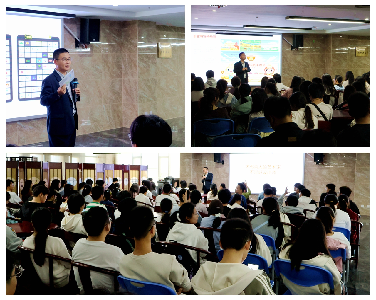 互动环节中黄老师给我们展示了他从事设计生涯的众多设计作品,各种标识、网站、动画、宣传册、我校一卡通等,并给在场的同学们答疑解惑,交流经验,亲和力十足。黄老师还进行了现场抽奖,送出了多枚中国农民丰收节纪念币。