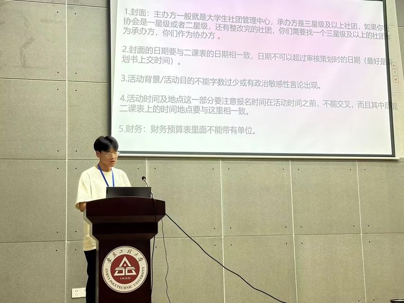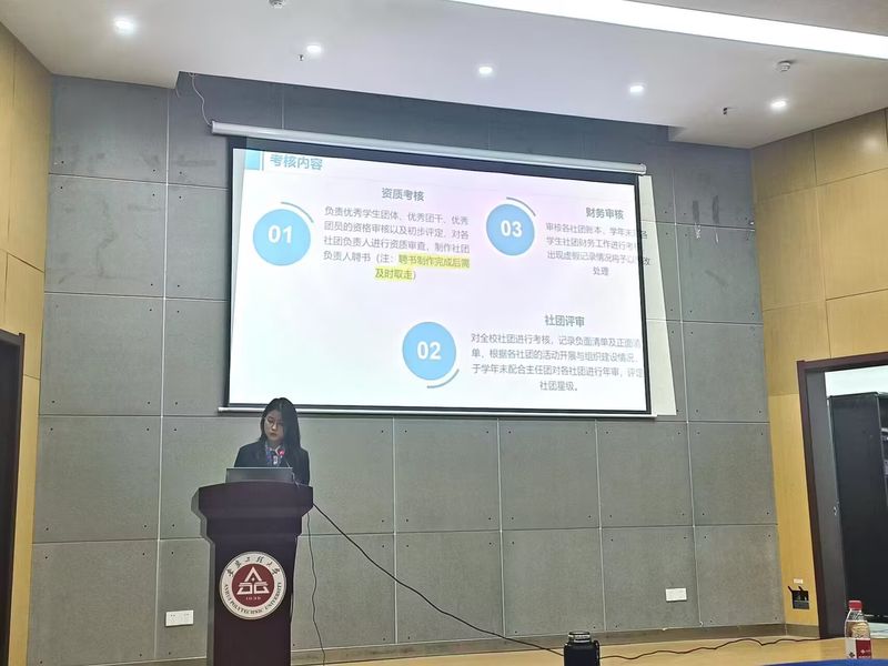 第十九届校团联会主席刘锦分享了自己在校团联会工作的感受和收获的成长,对社团管理中心如何做好学生社团的管理和服务工作提出了建议。大学生社团管理中心主任程梦晖汇报了年度工作计划。大学生社团管理中心活动策划部、监督服务部、综合管理部代表依次进行部门职能介绍,对活动策划书的编写、第二课堂的使用、活动总结书的撰写、海报推文宣传及物资借记等事项进行了培训,帮助社团负责人更快熟悉工作。