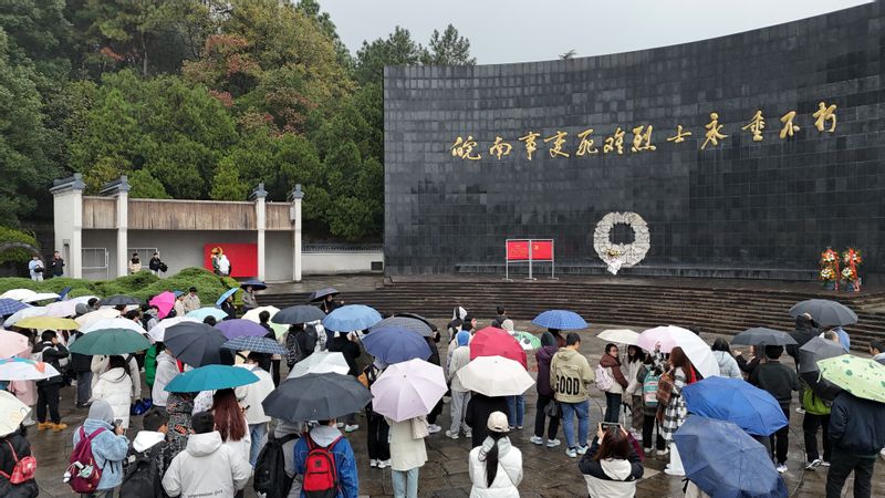 实践教学第一站,皖南事变烈士陵园。皖南事变烈士陵园位于泾县水西山,是1990年初为纪念皖南事变新四军将士殉难五十周年而修建。在讲解员的悉心讲解和带领下,老师和学生们参观纪念碑、纪念廊、无名烈士墓,了解了许多革命烈士事迹,感悟革命精神。随后献上花圈以缅怀先烈。