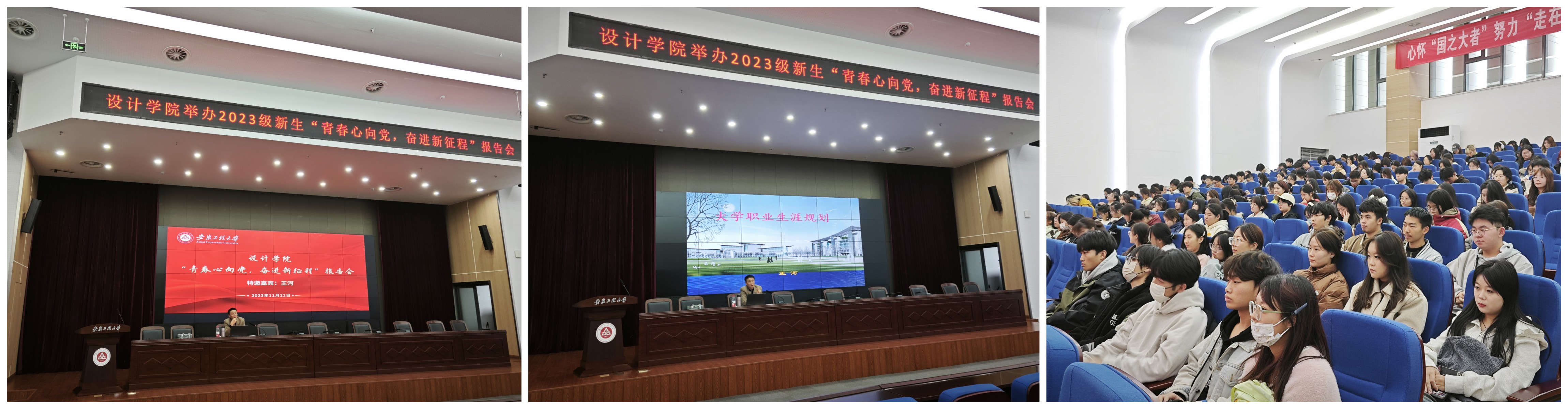 11月22日,设计学院在图书馆报告厅举办2023级新生“青春心向党,奋进新征程”报告会。我校退休干部,原学生处处长、就业指导中心主任,校工会主席王河老师应邀主讲,他以“大学职业生涯规划”为题,围绕“职业取向”“价值追求”“发展关键任务”和“生涯设计”等维度,结合安徽工程大学优秀校友生涯发展案例展开讲座,“面对面”向新生分享、讲述学校“三做”教育理念,引导同学们以目标、能力、个性为导向,转变自我认知,明确目标以更清晰的方向规划自己的职业生涯;鼓励同学们要时刻谨记当代青年人的使命担当,开阔视野、探索未知,把握趋势、勇于创造,守正创新、多元发展,为服务国家富强、民族复兴、人民幸福贡献力量。