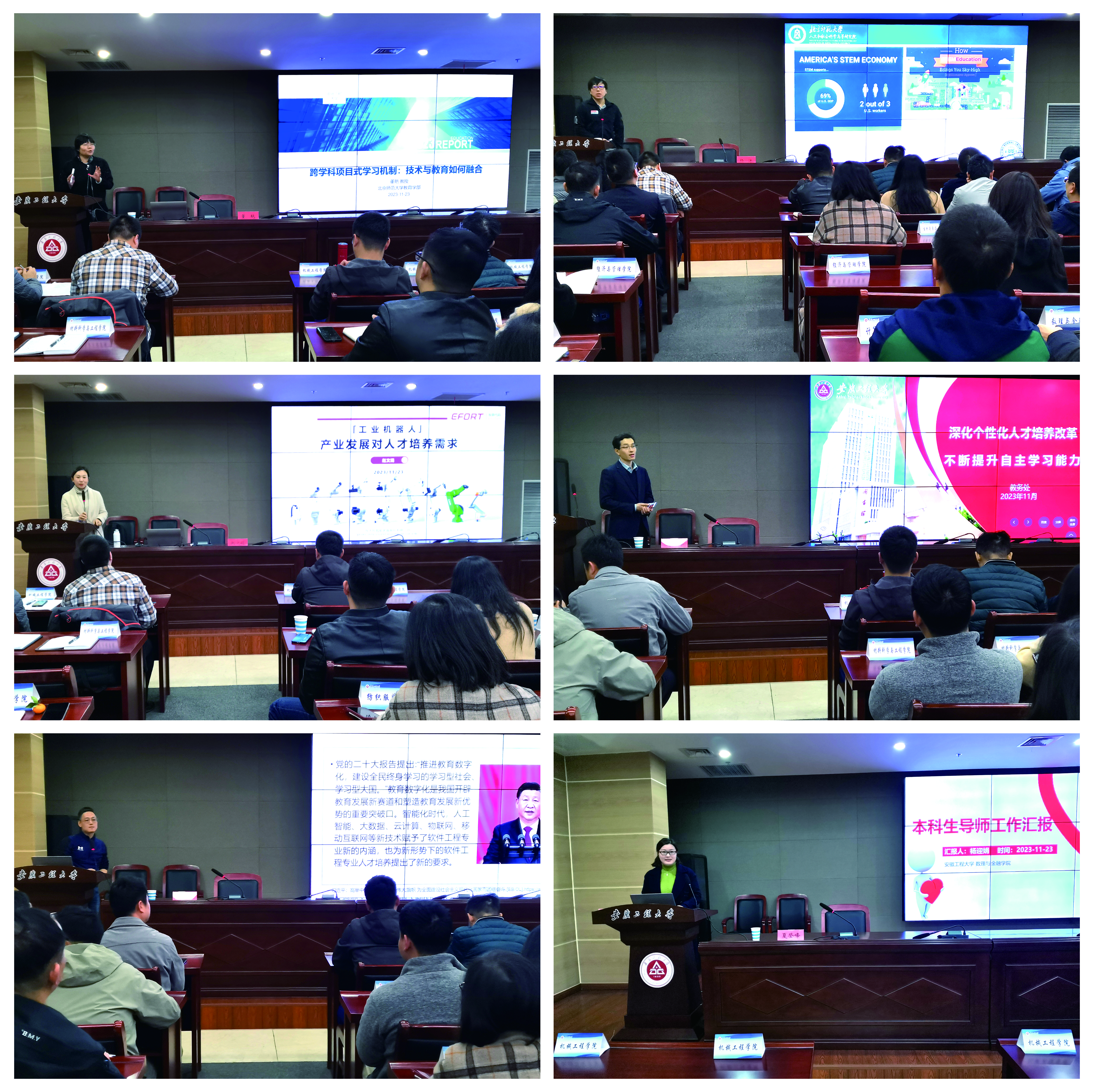 期间,北京师范大学教育学部教授董艳、北京师范大学人文和社会科学高等研究院杨洋、埃夫特智能装备股份有限公司人力资源部部长赵文娟、教务处副处长夏登峰、计算机与信息学院软件工程系主任严楠、数理与金融学院区块链工程系副主任杨迎娟分别就项目式教学、校企合作与创新能力培养、个性化人才培养、基层教学组织建设与发展、本科生导师等内容作了主题报告。