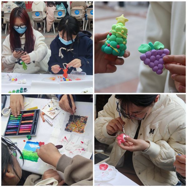 本次活动包括手工布艺区、泥塑绘画区、黏土制作区、油画素描区、流体熊涂鸦区五个区域,为同学们开启一场丰富的心灵治愈之旅。活动现场,同学们凭借精细的穿针引线和灵活裁剪制作出证件套、钥匙扣、书签等惟妙惟肖的工艺品;从调色、配色再到成型的过程中赋予了纯白石膏娃娃绚丽的新生命,挥洒创意的同时放松身心;发挥想象力揉捏出派大星和蟹老板的友谊情深、玫瑰花的浓浓爱意和多啦A梦的温暖强大,以美好作品寄托心之所向。用妙笔生花,展现宁静的自然风光、初升的绚丽朝阳、璀璨的夜空烟火,以缤纷色彩和丰富图案绘制自己的创意和心情。灵感与实践碰撞,以“勤”起来挖掘“乐”的幸福源泉。