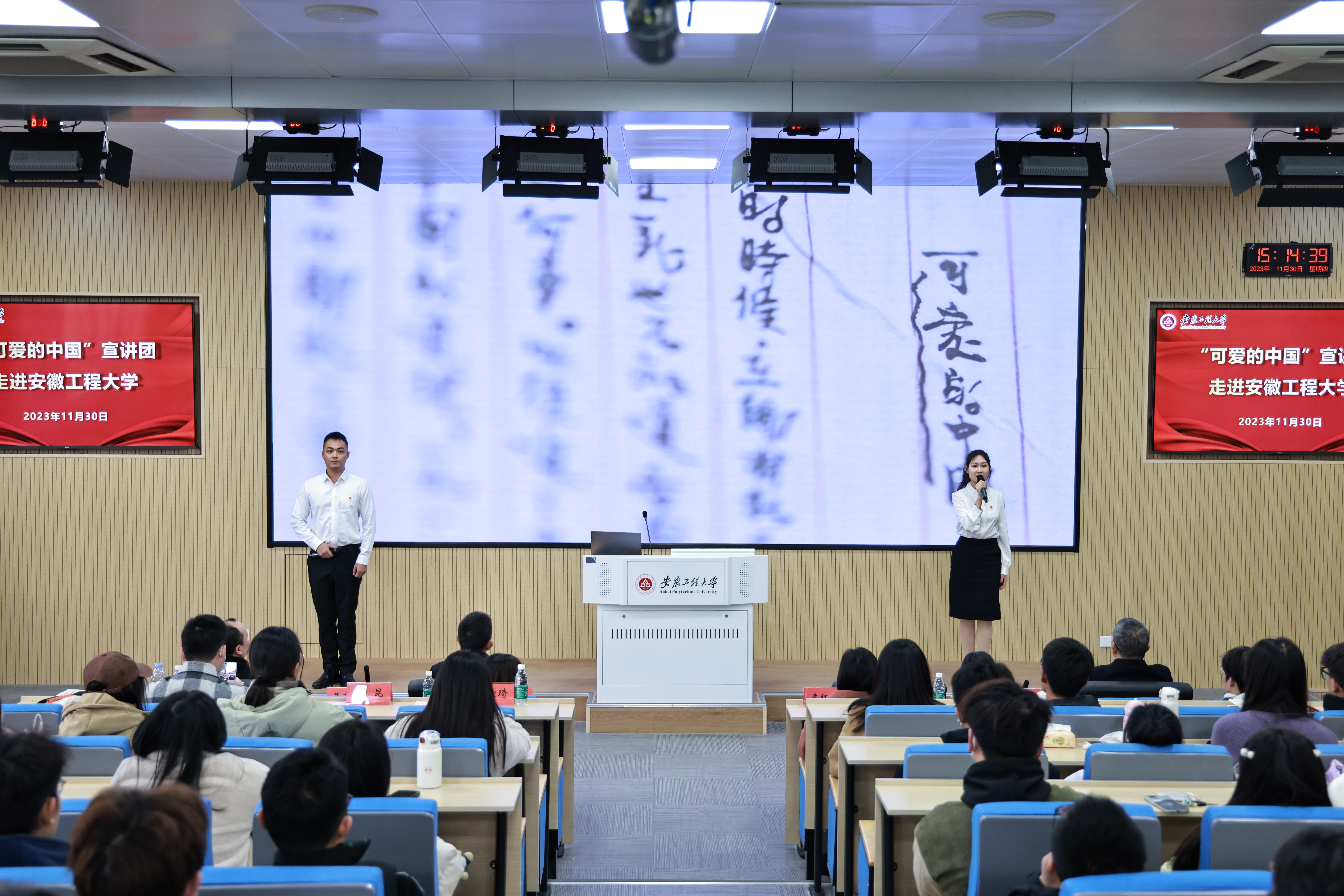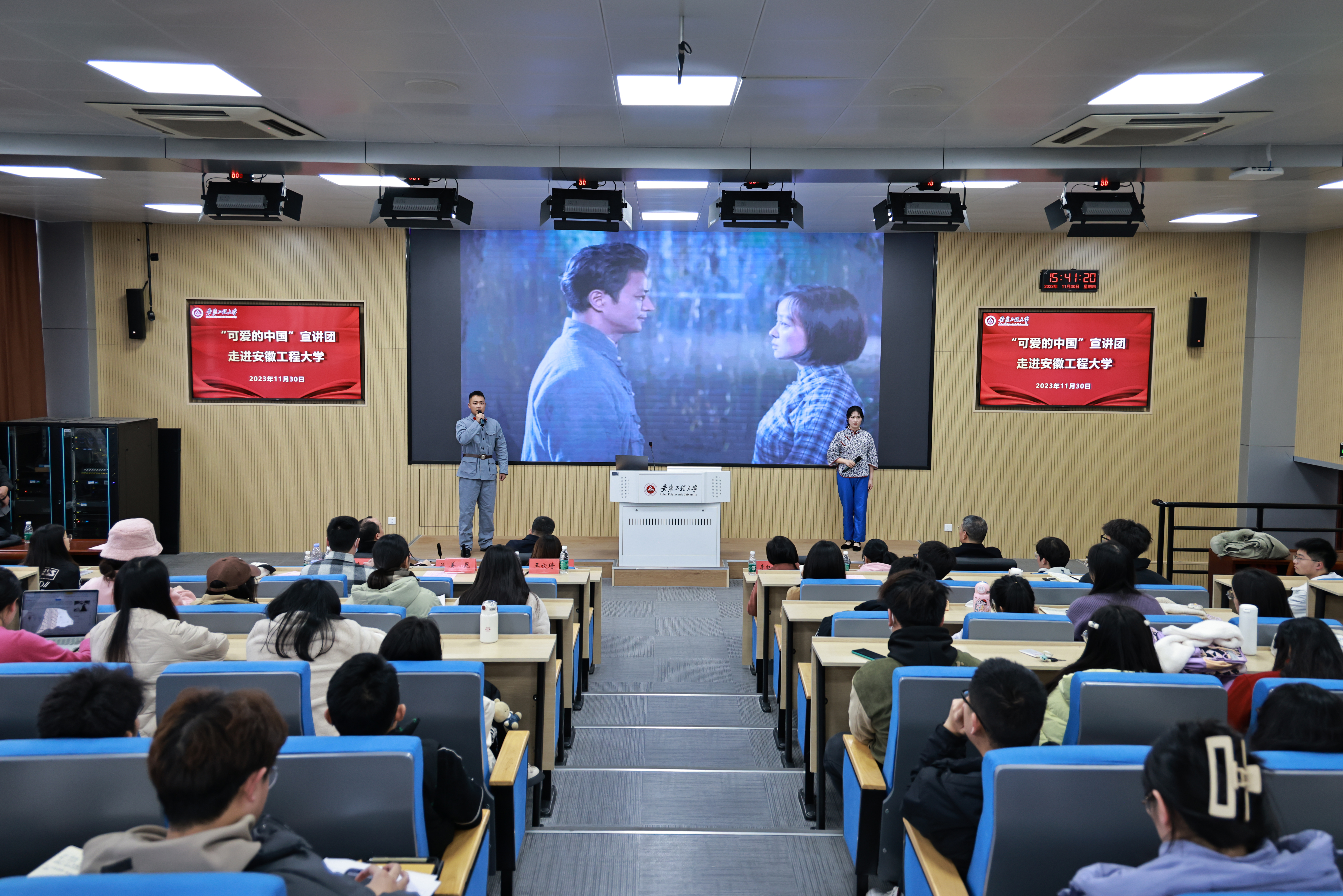 “可爱的中国”宣讲团以红色故事“情景声画”宣讲剧的形式,围绕“第一篇章:爱国创造践初心”“第二篇章:清贫奉献为人民”“第三篇章:传承发展谋复兴”三个部分展开宣讲,生动再现了方志敏烈士光辉而又短暂的一生,带着台下同学们深切感受了方志敏“爱国、创造、清贫、奉献”的革命精神,传诵了以方志敏为代表的革命先辈们的伟大信仰、无畏精神与炙热初心,方志敏烈士的伟大人格和革命精神感染了参加宣讲会的全体师生。