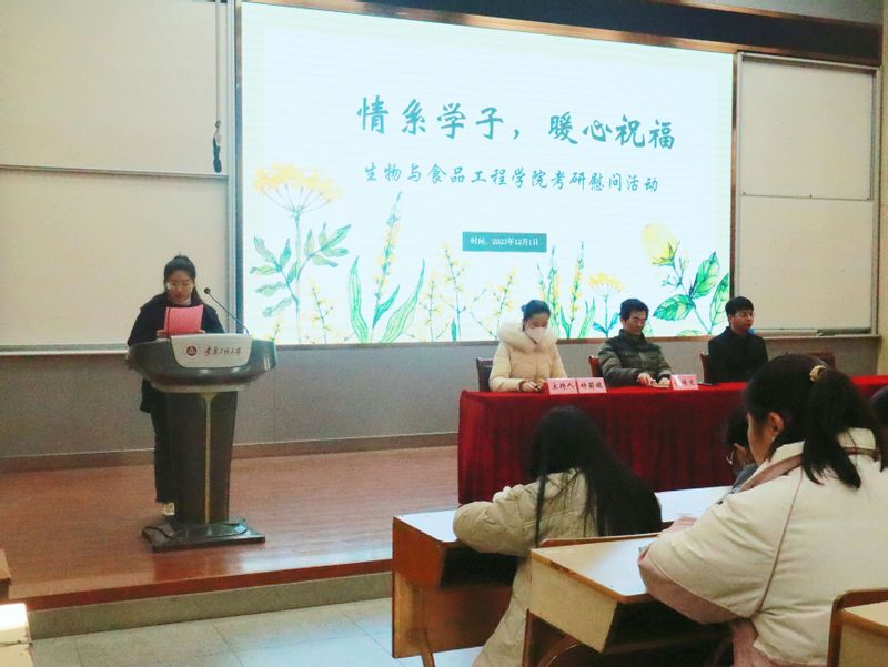 本网讯 为缓解考研学子压力,坚定考生冲刺信心,12月1日,生物与食品工程学院在2教报告厅举办了“情系学子 暖心祝福”考研慰问党日活动,学院党委书记余传文、辅导员李良渊及2024届全体考研备考生出席参加本次活动。活动由毕业班辅导员钟莉娟主持。