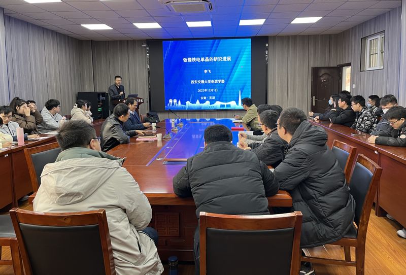 林元华做题为“面向高端电子用先进电介质材料及器件”的学术报告。报告详细介绍了电介质薄膜储能电容器及其介质材料的最新研究进展,特别是如何利用电畴工程、多相复合、高熵设计突破无机薄膜介质储能技术领域瓶颈问题的新思路和新方法;李飞做题为“弛豫铁电单晶的研究进展”的学术报告,介绍了弛豫铁电体材料的发展历史,以及弛豫铁电单晶方面的最新进展,特别是西安交大团队在推动压电单晶材料商业化应用方面所做的不懈努力。