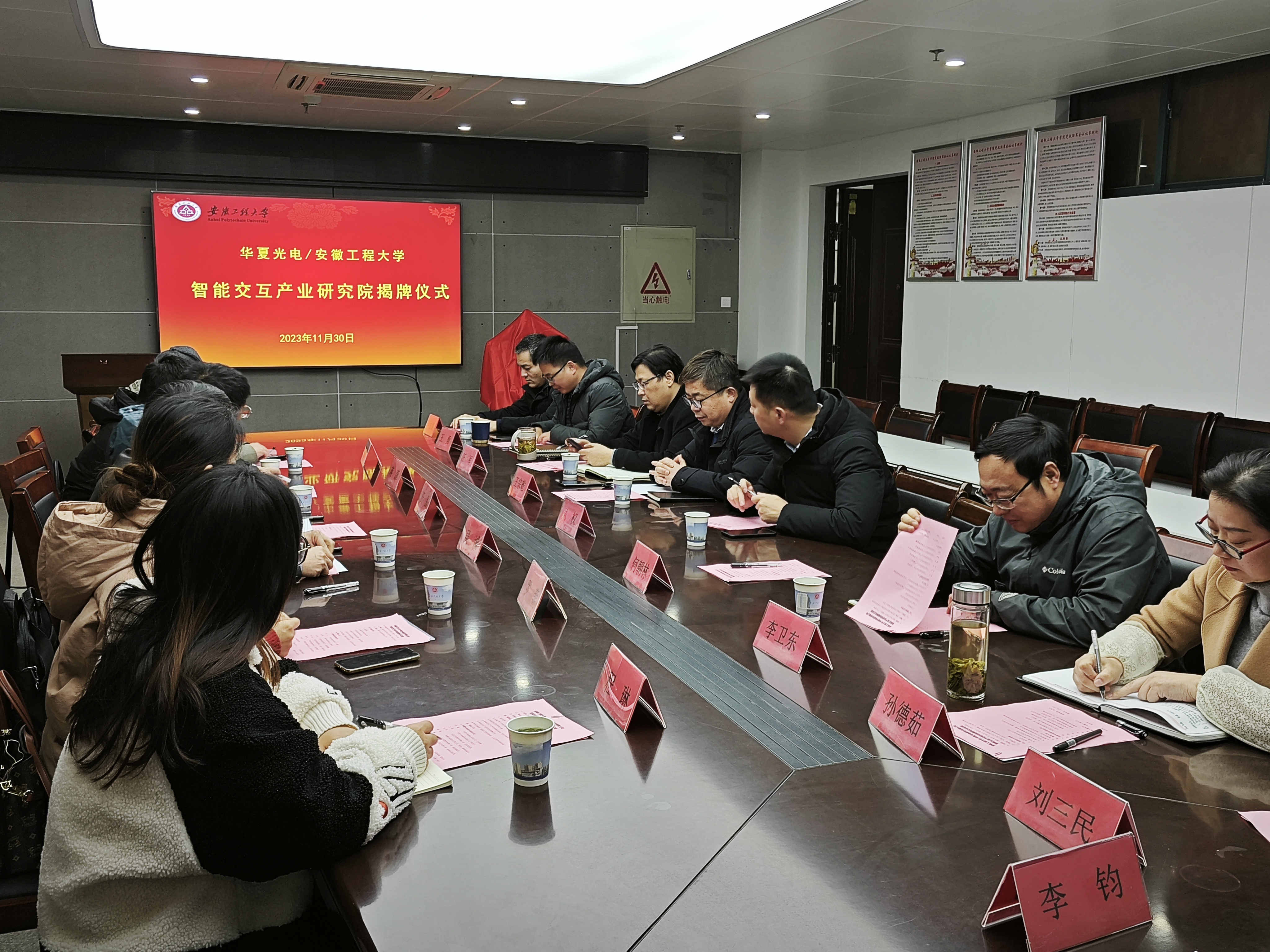 本网讯 11月30日,学校与安徽华夏光电股份有限公司(华夏光电)共建的智能交互产业研究院揭牌。校党委常委、副校长凤权,华夏光电总经理吴诚等出席活动。学校相关部门和计算机与信息学院党政主要负责人参加了本次活动。