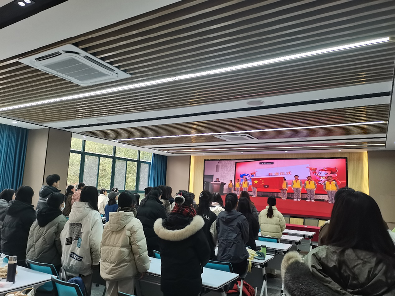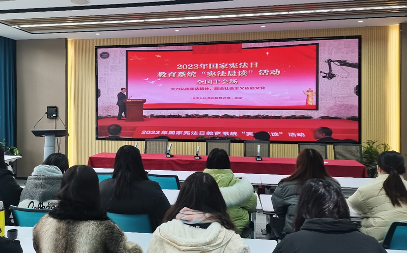 学院同步连线教育部在北京设立的“宪法晨读”活动主会场参与活动。伴随着庄严的国歌声,“宪法晨读”活动正式拉开序幕。同学们通过直播同步跟读宪法部分条款,感受宪法的神圣和庄严。在主会场的领唱下,全体同学共同跟唱了歌曲《宪法伴我成长》,还聆听了主会场上四位全国优秀青少年带来的精彩演讲。
