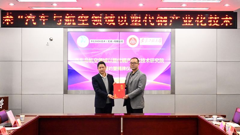 徐大勇、周永松代表双方签署了共建协议。周虹屏和周永松为“汽车与航空领域以塑代钢产业化技术研究院”揭牌,并为化学与环境学院高建纲教授颁发研究院院长聘书。