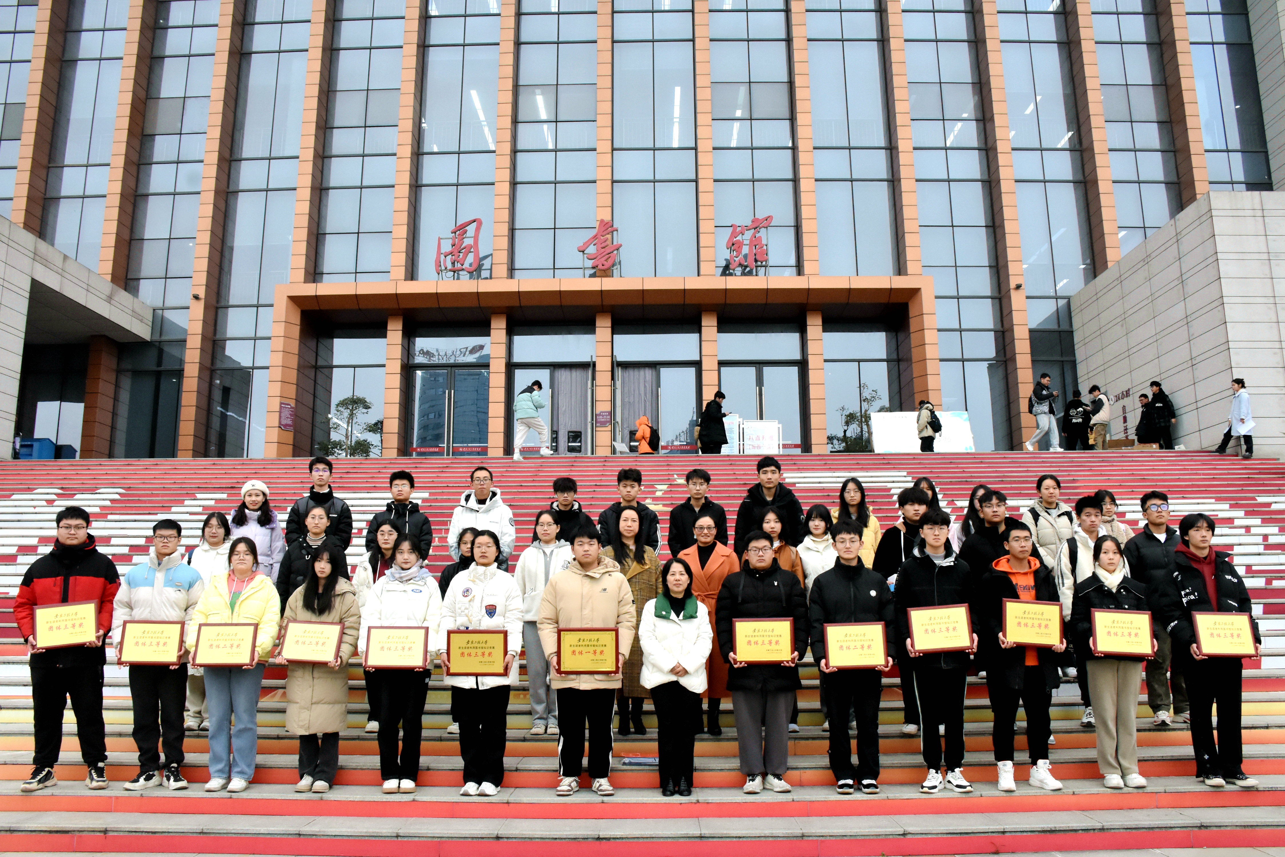 2023级新生利用图书馆知识竞赛在校各学院的大力支持下,由十四个学院各选送5名参赛选手组成团队进行比赛,先后经过了参赛选手报名、赛前培训、上机考试、获奖结果公示、颁奖活动等阶段。经过激烈的比赛角逐,生物与食品工程学院代表队获一等奖;经济与管理学院、人文学院、人工智能学院3个代表队获二等奖;化学与环境工程学院、数理与金融学院、设计学院、机械工程学院、计算机与信息学院、建筑工程学院、纺织服装学院、外国语学院、材料科学与工程学院、电气工程学院(集成电路学院)10个代表队获三等奖。李琛、张彤彤、郭红转三位老师分别为获奖团队进行了颁奖。根据竞赛成绩及公示结果,给个人单项奖得主颁发了奖状及奖品。纪福康、李嘉诚、盛泺兮、李玉婷、王嘉诚5人获个人一等奖;戴甜甜、姚婷婷、陈静如等9人获个人二等奖;魏玉海、王雨欣、袁安婕等20人获三等奖;赵润杰、孙先博、方敏等36人获个人优秀奖。